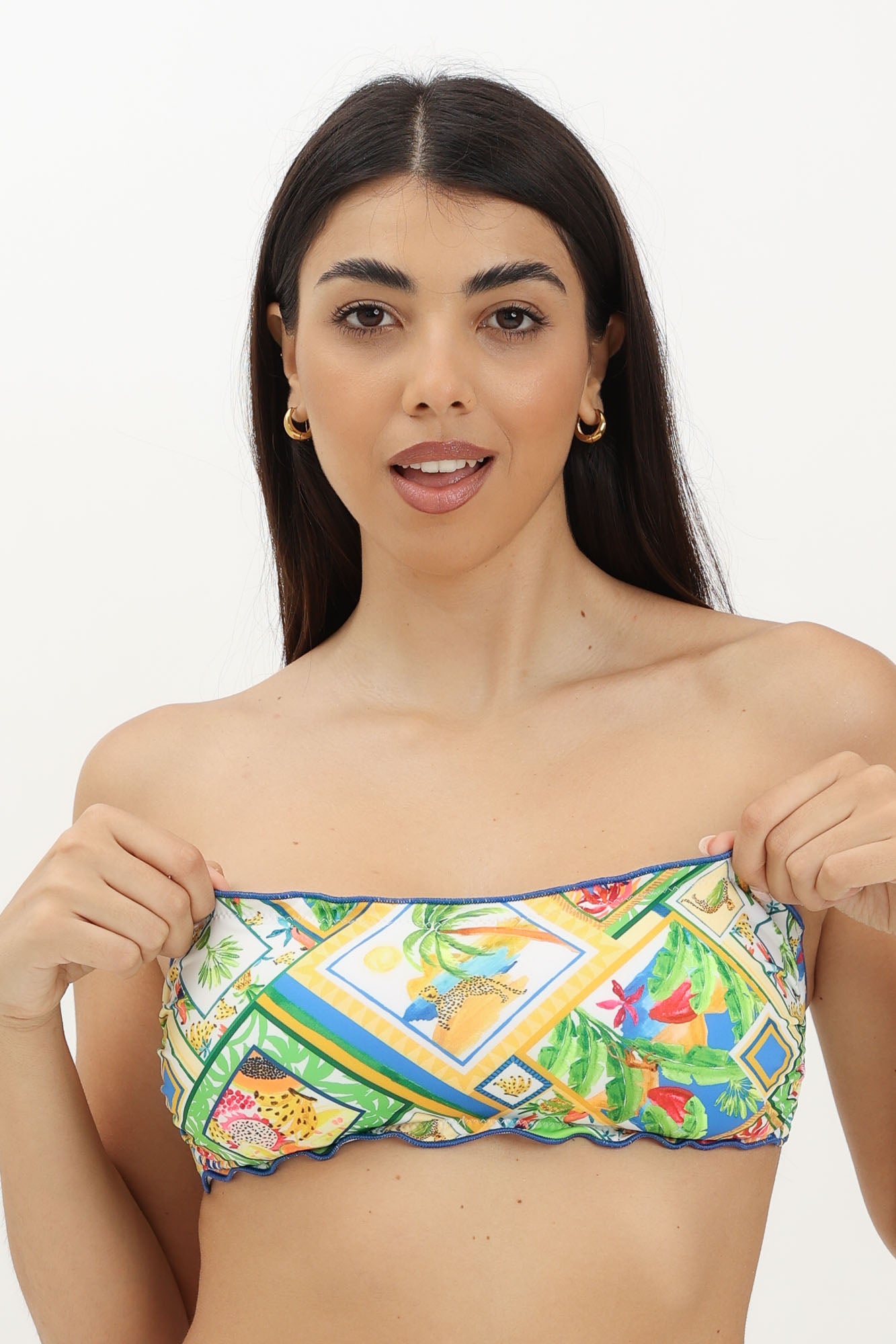 Triangolo Frou-Frou con orlo arricciato e coppe preformate estraibili, realizzato in microfibra morbida con fantasie coordinate famiglia.