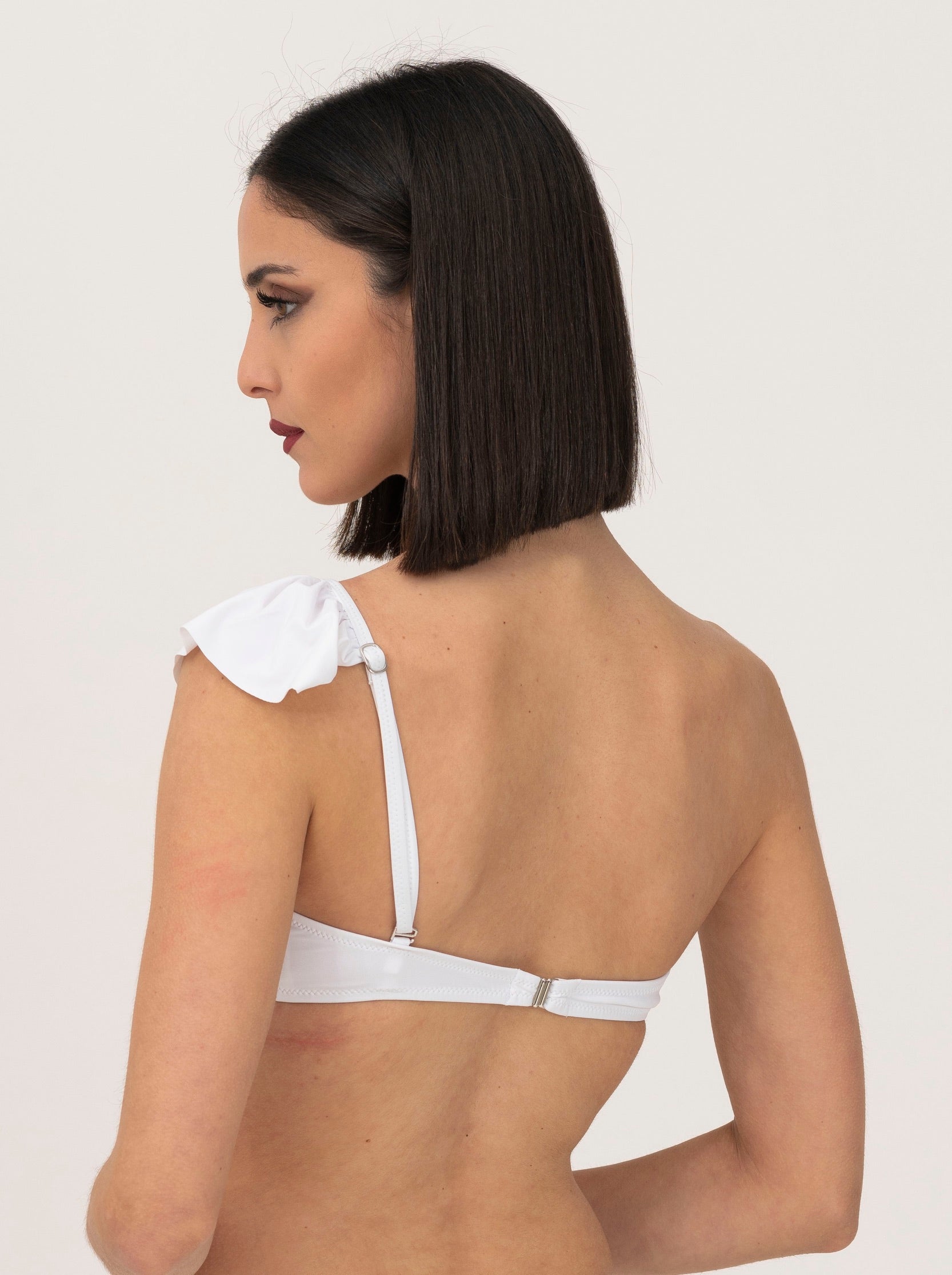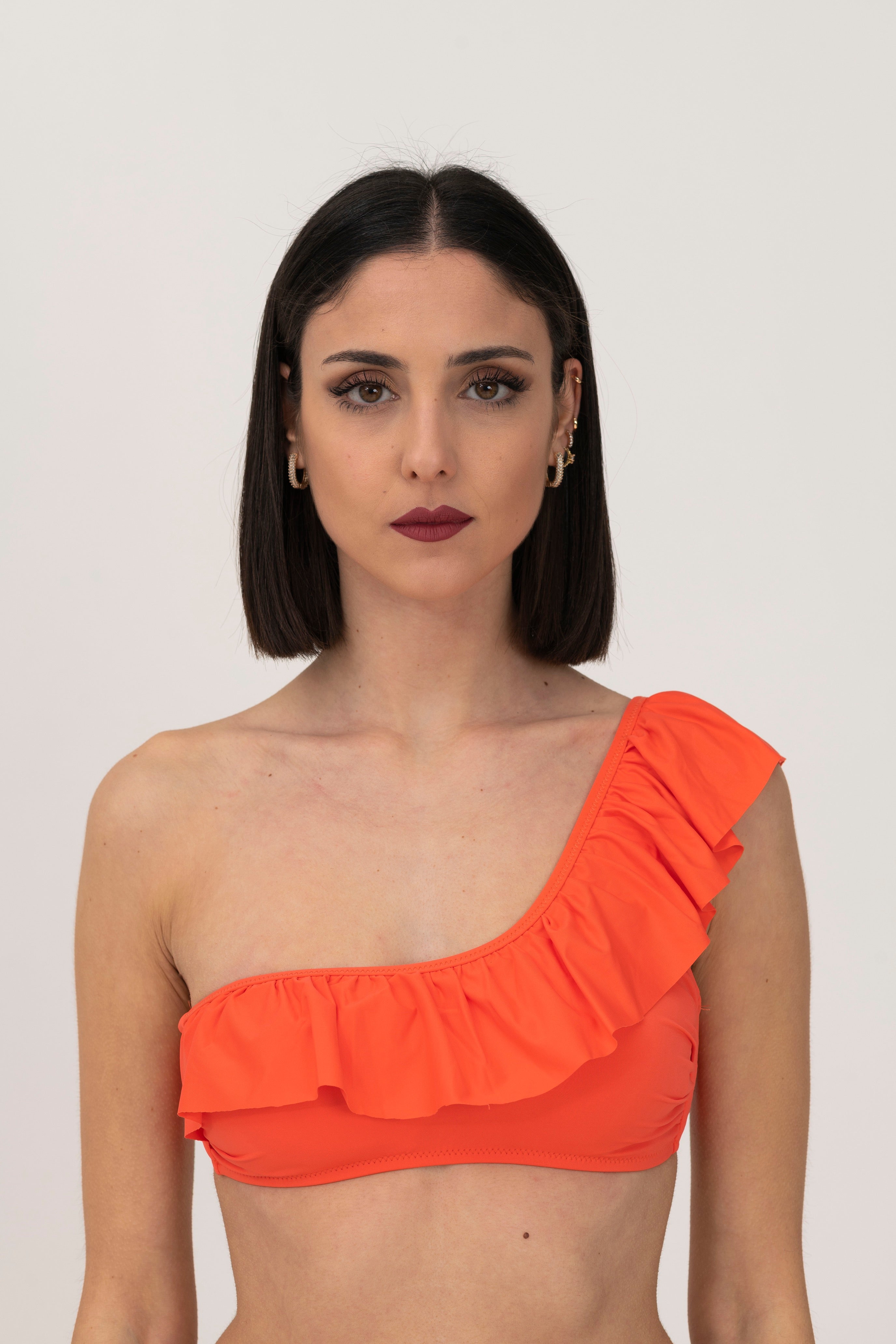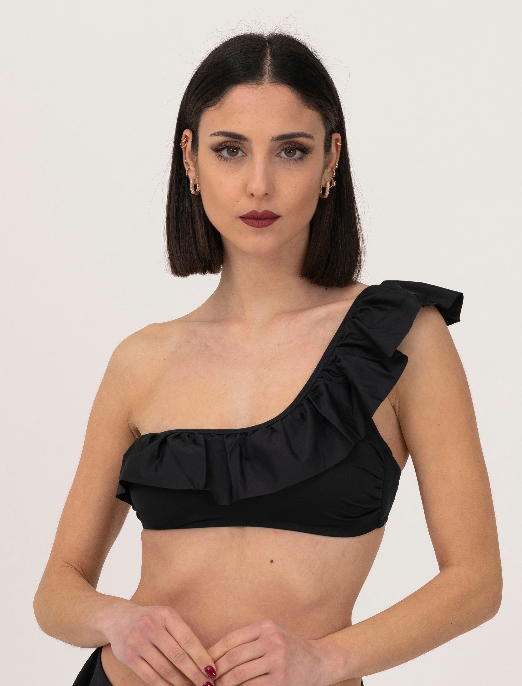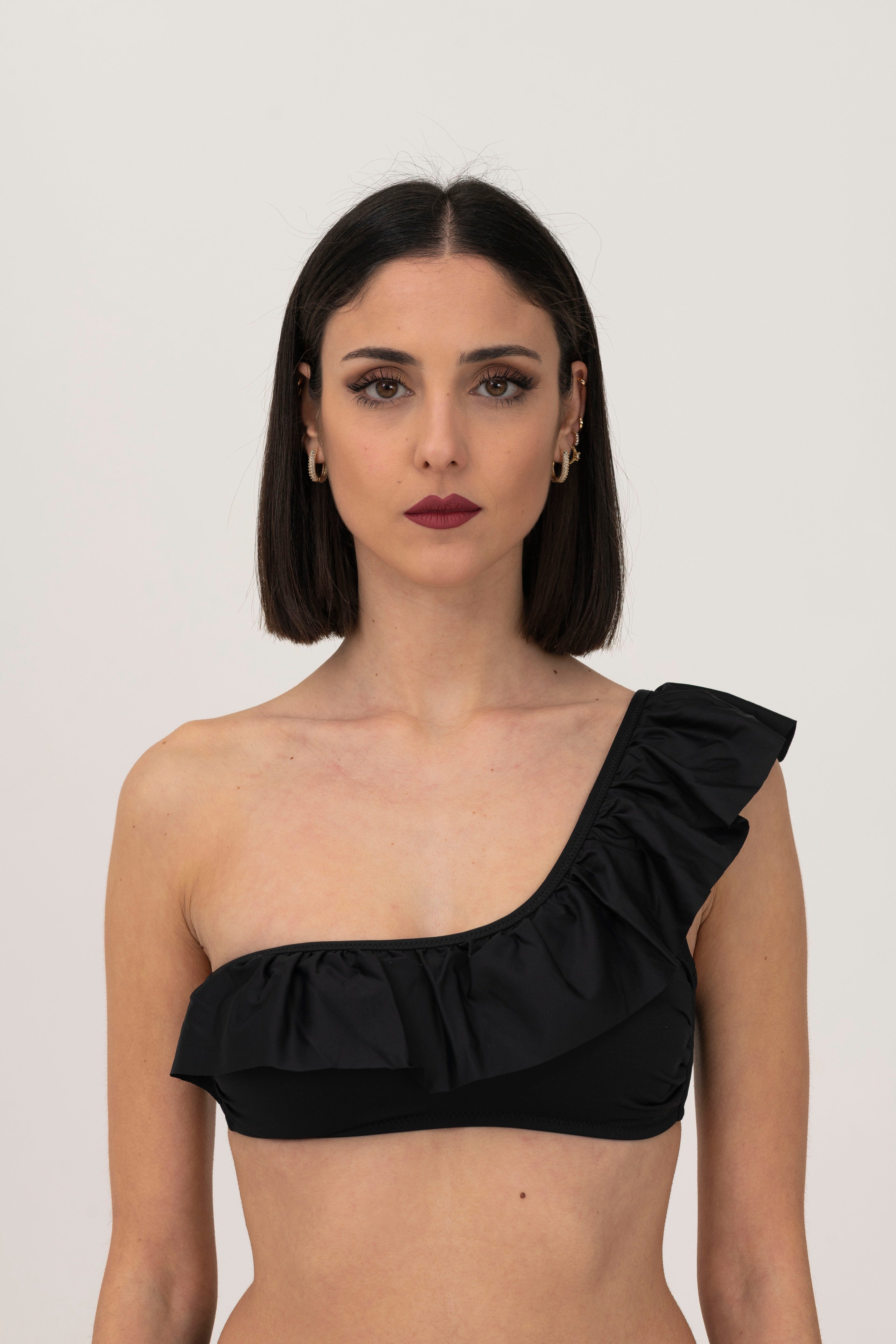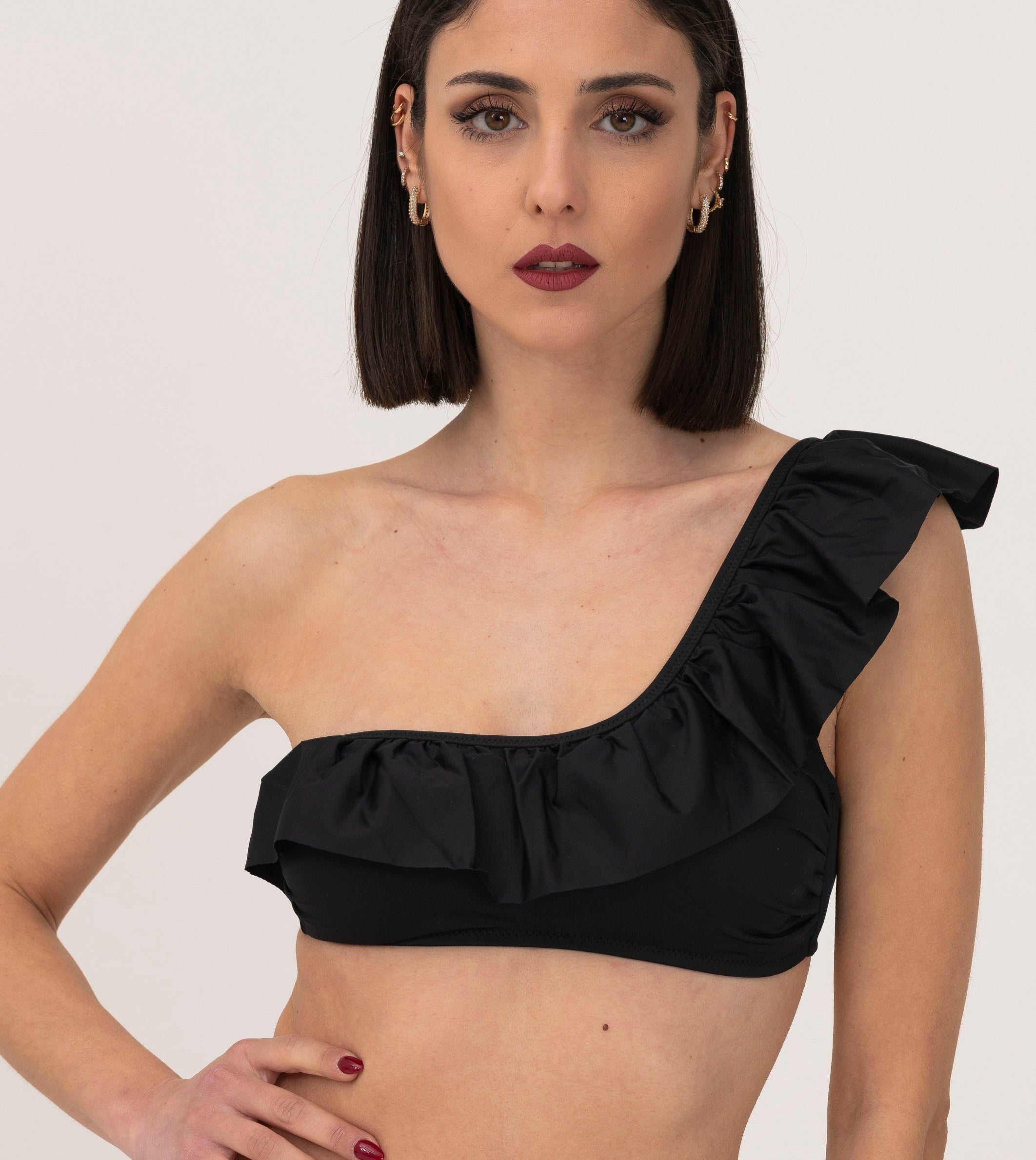 Fascia monospalla con volant .  Coppe estraibili , spalline regolabili e chiusura con gancio .