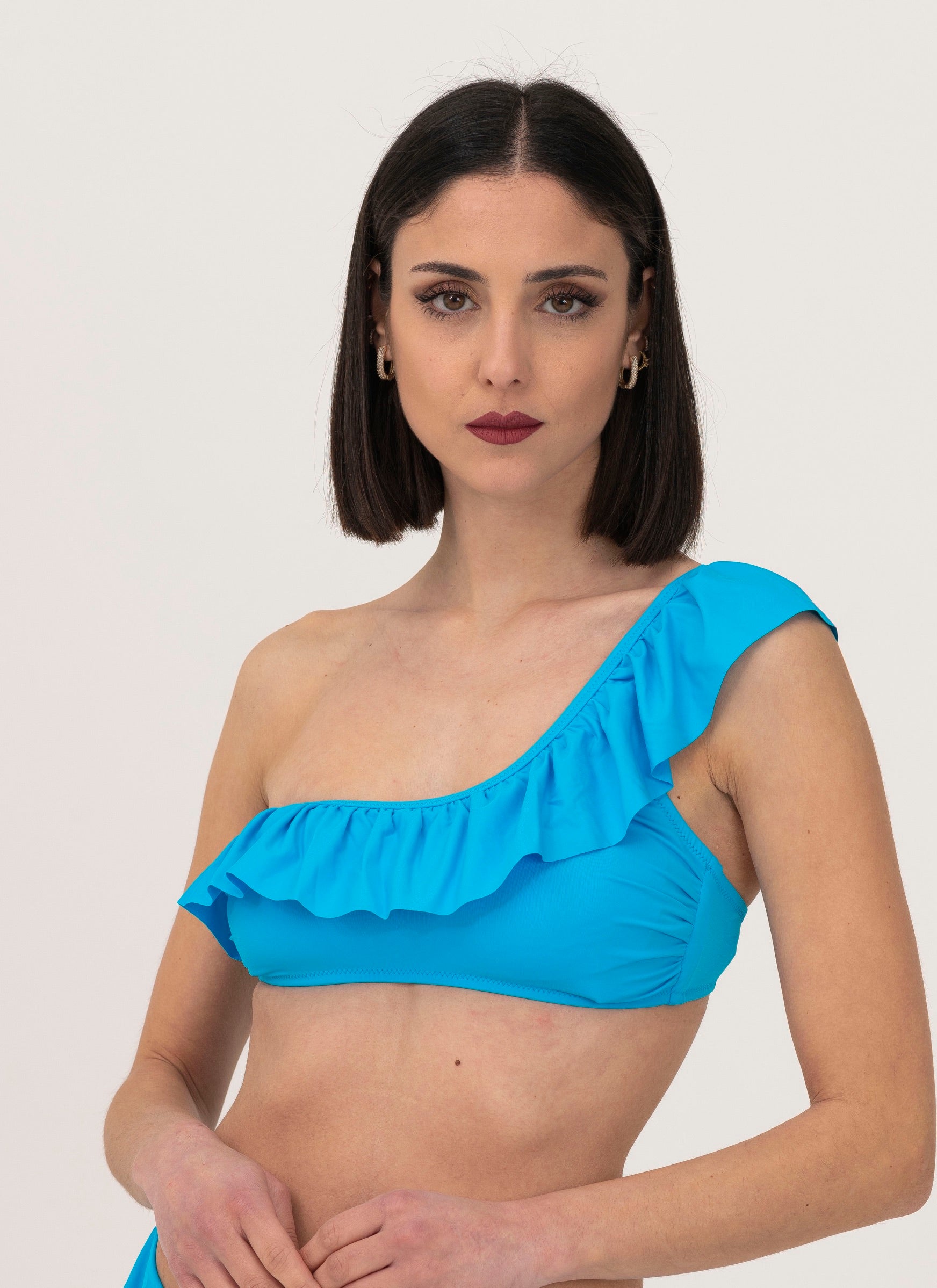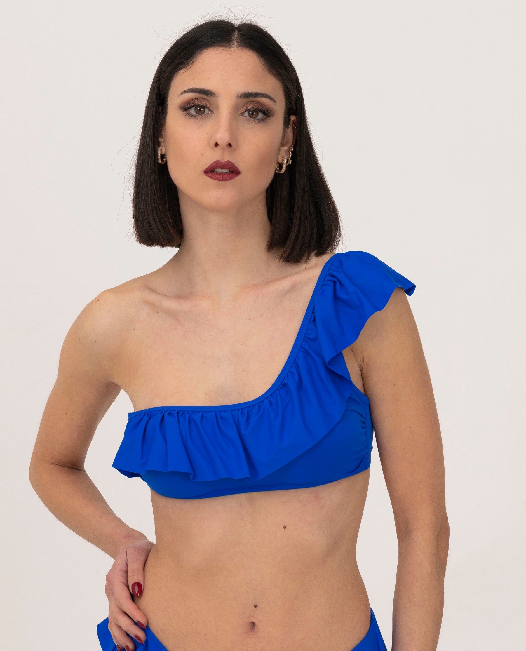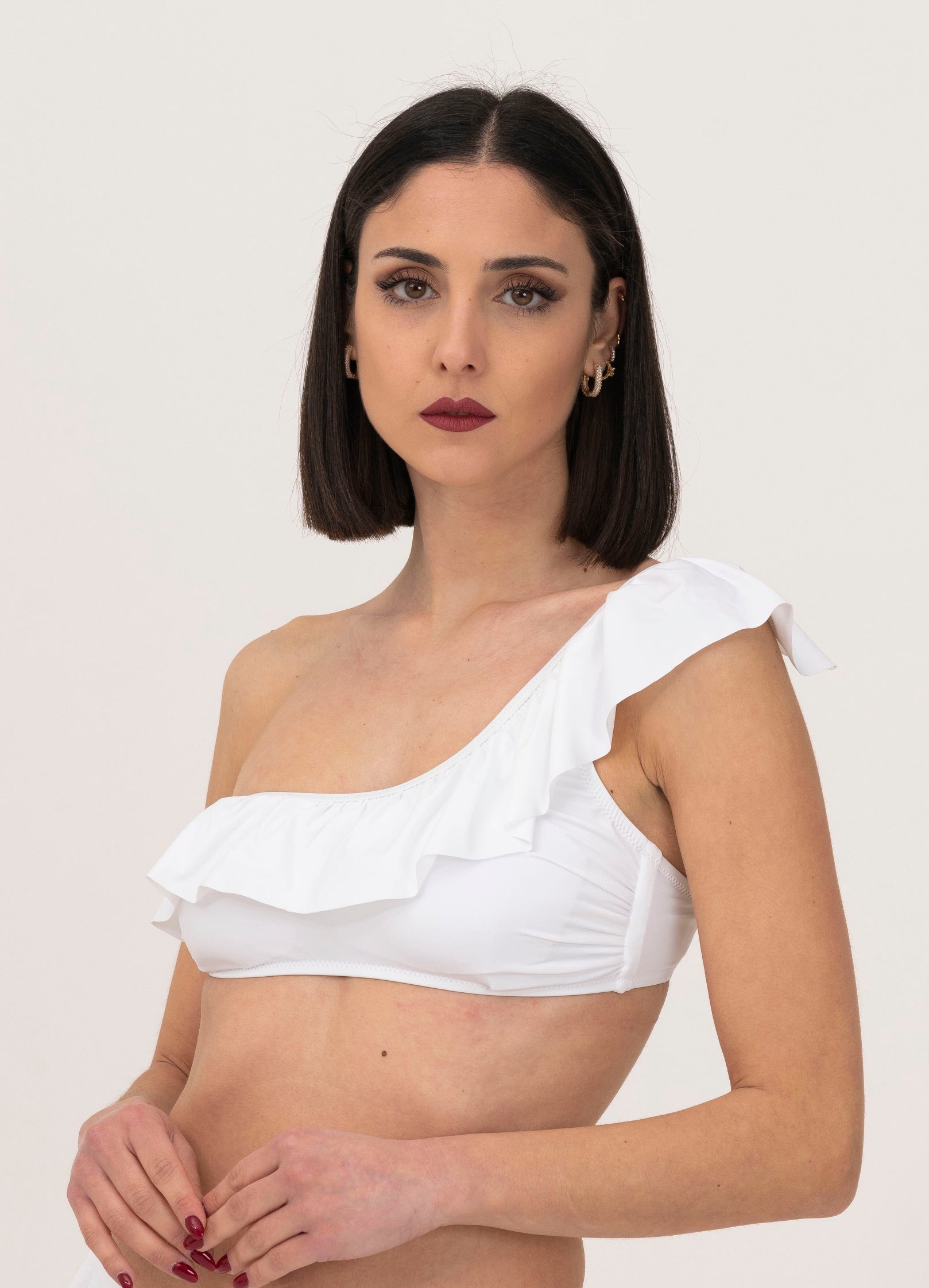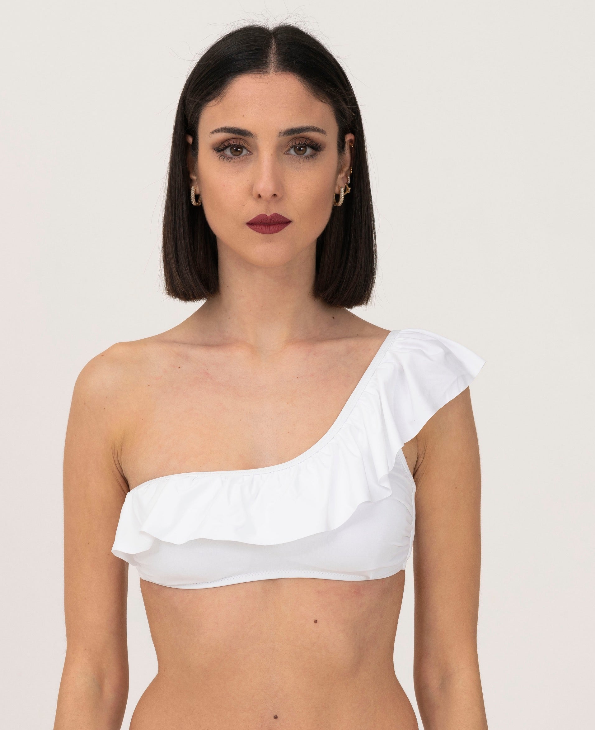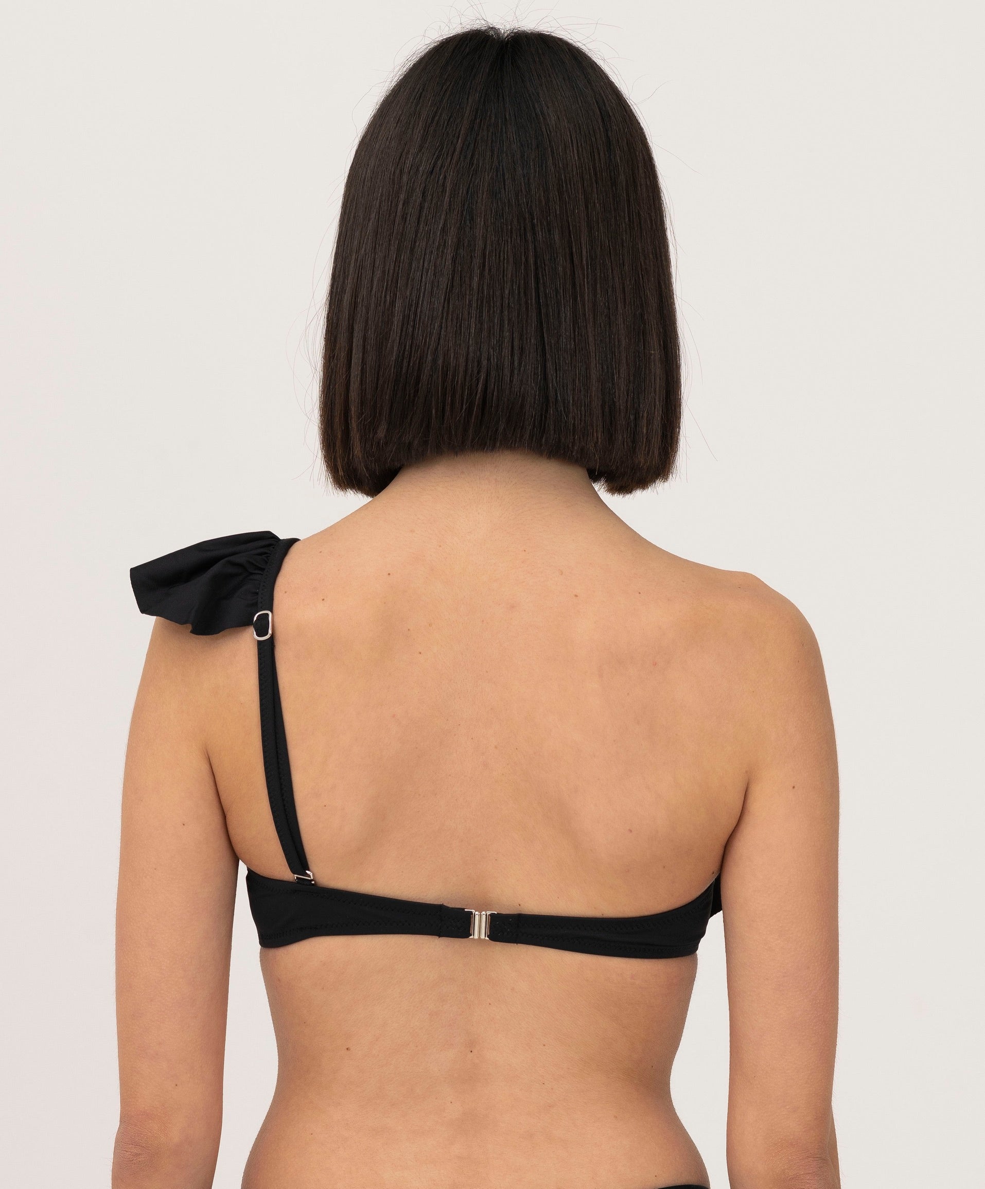 Fascia monospalla con volant .  Coppe estraibili , spalline regolabili e chiusura con gancio .