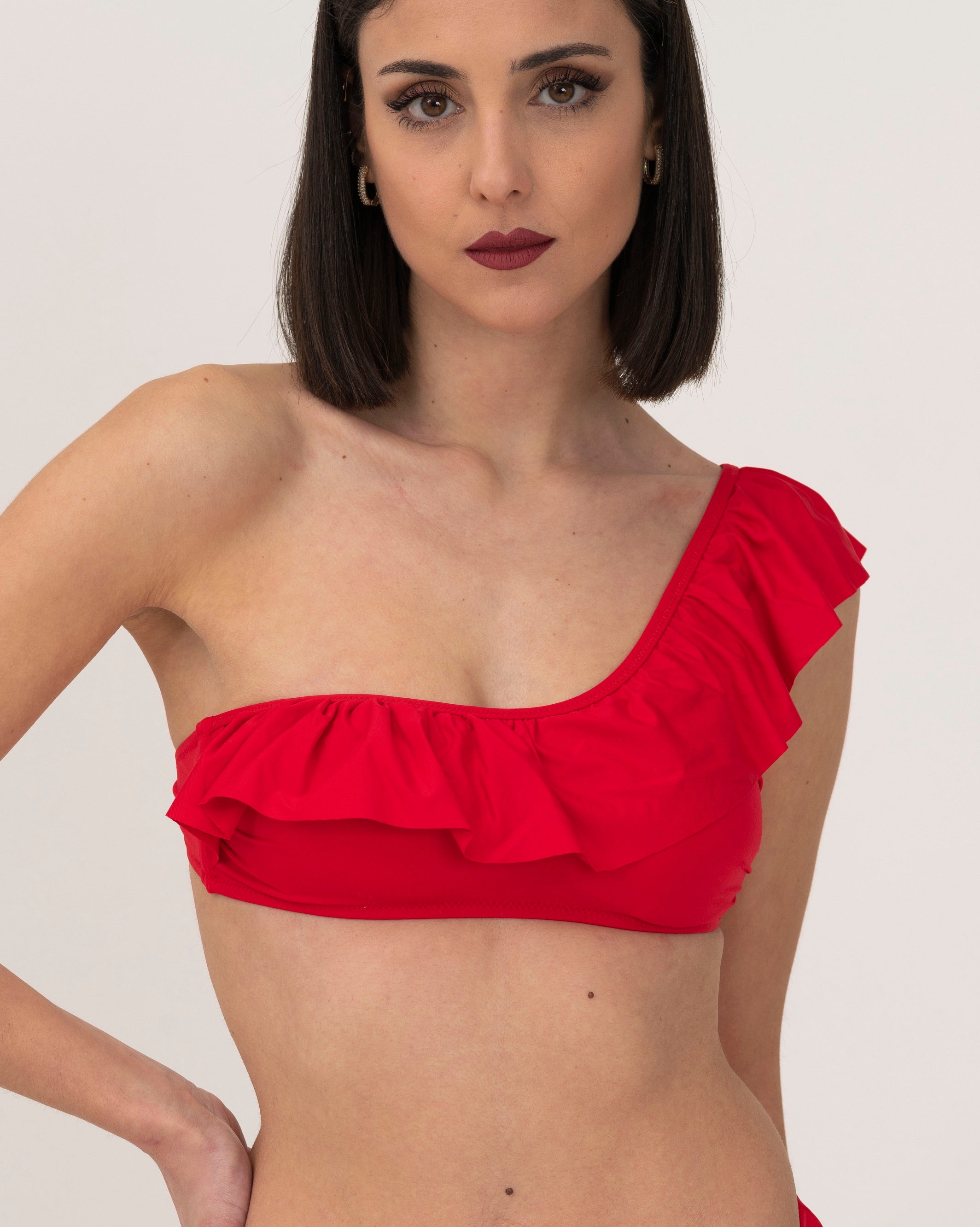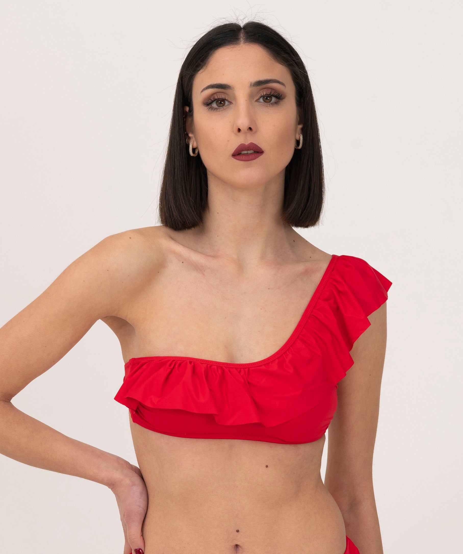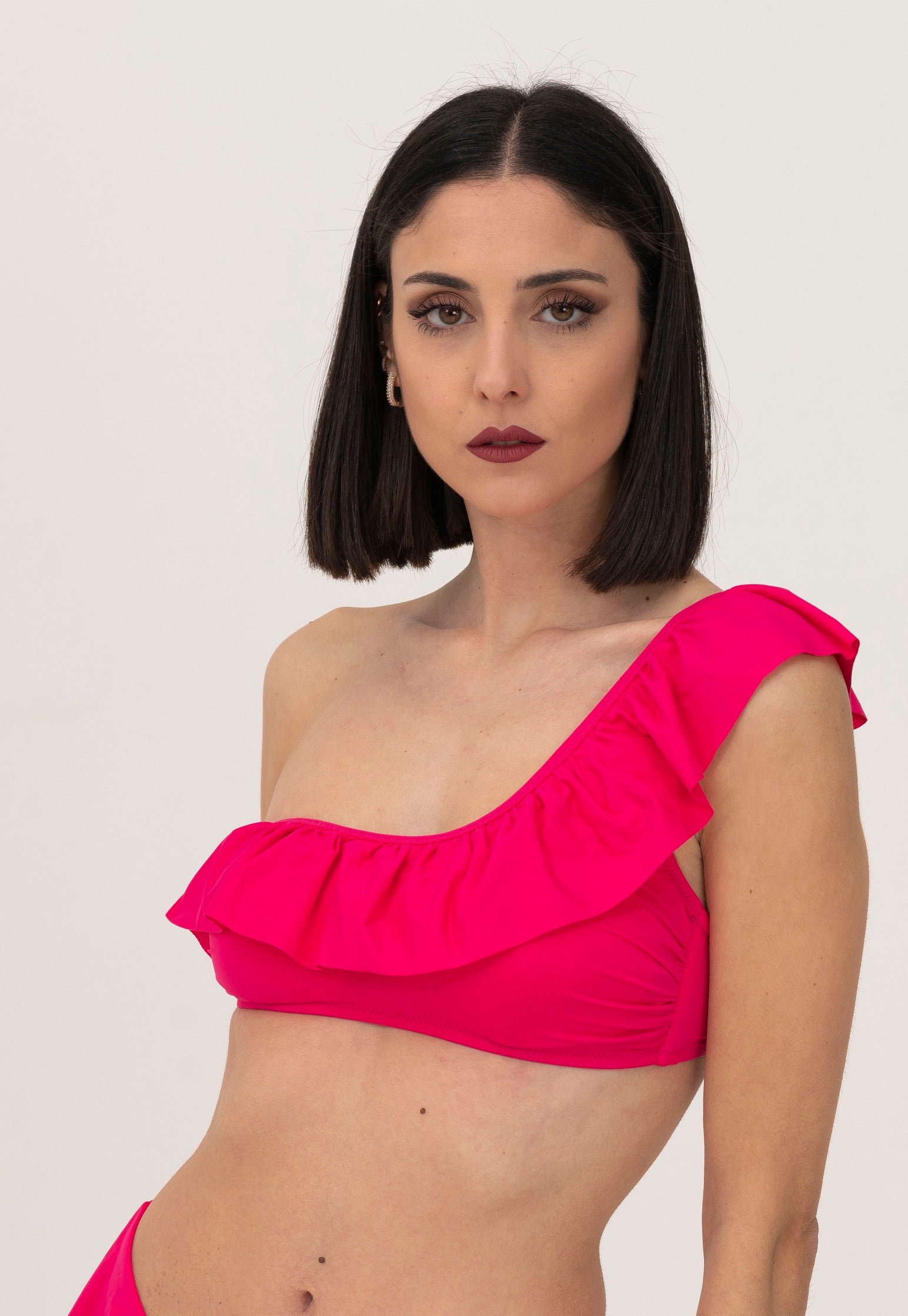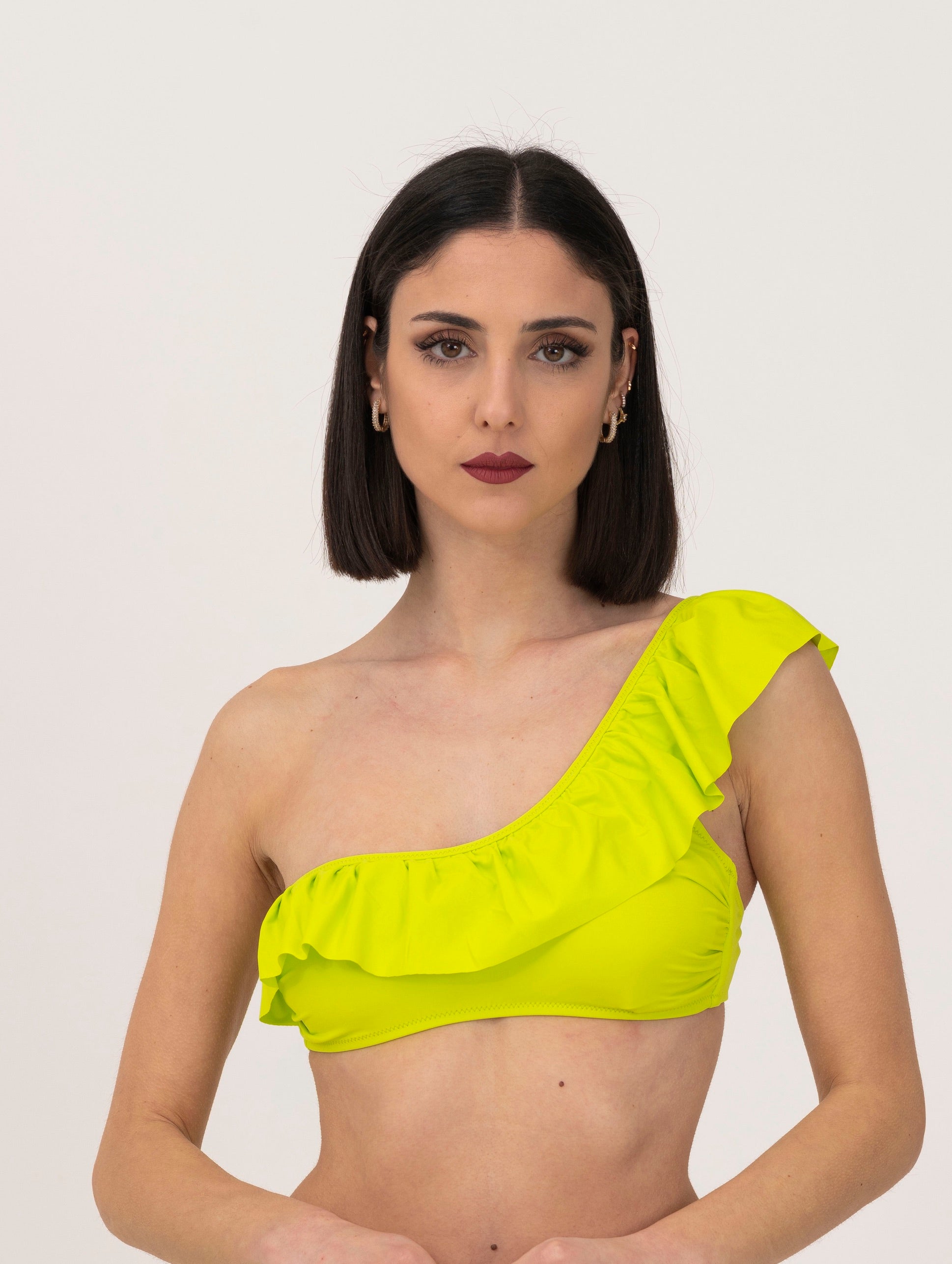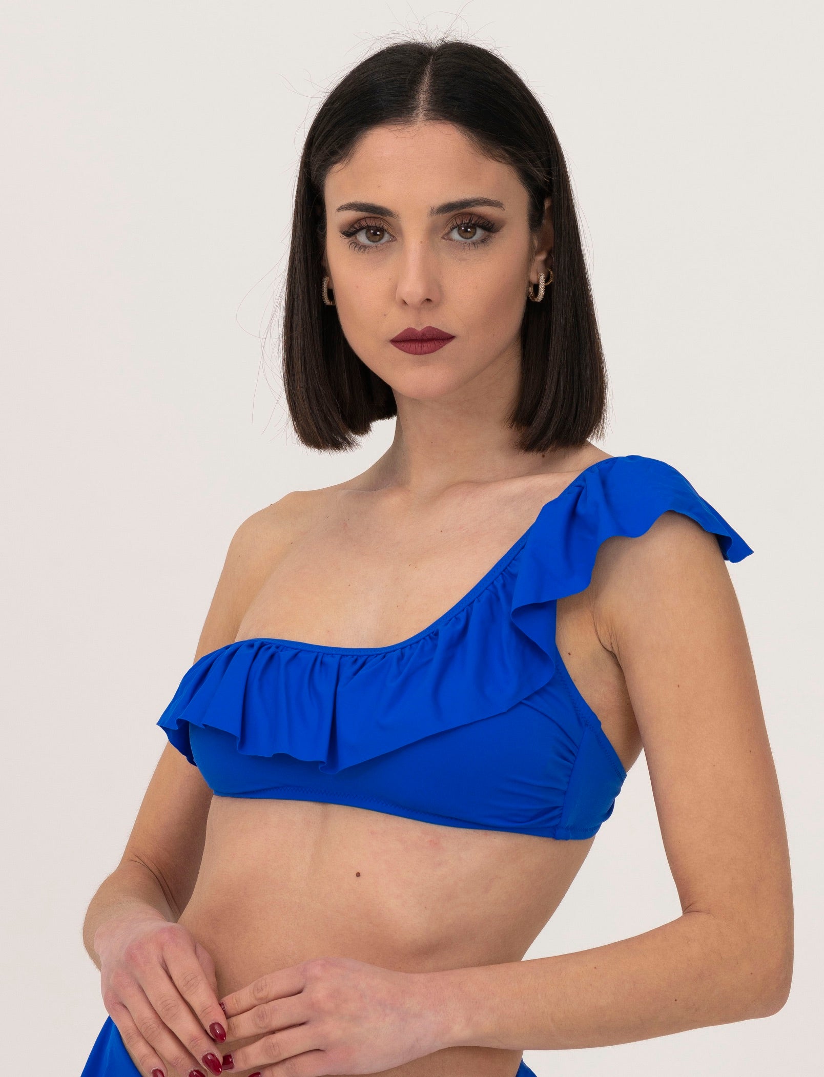 Fascia monospalla con volant .  Coppe estraibili , spalline regolabili e chiusura con gancio .