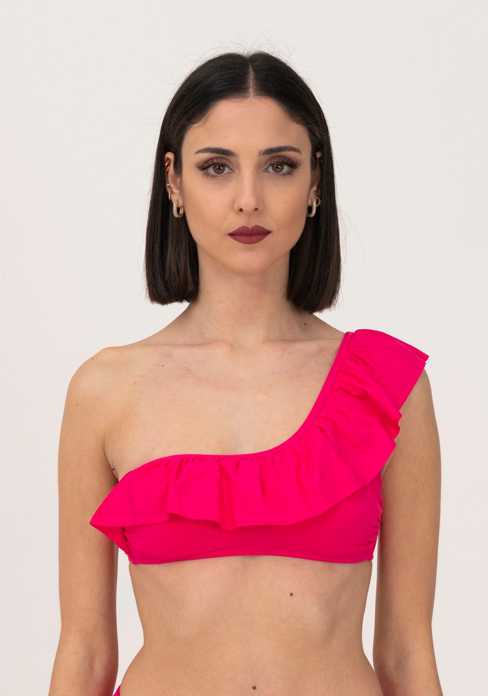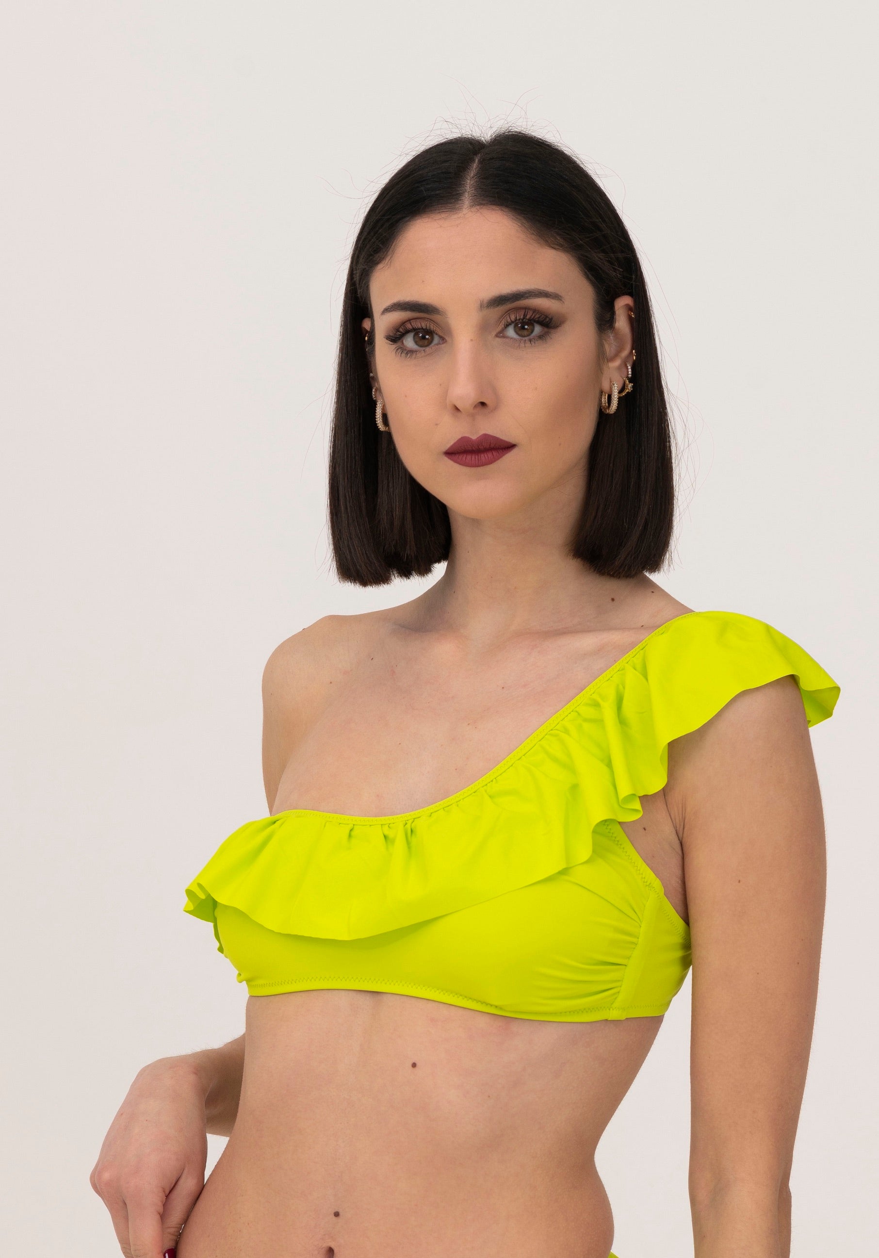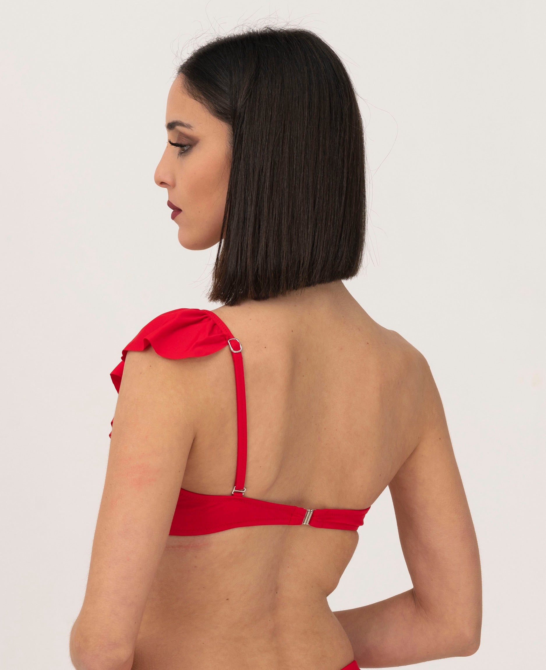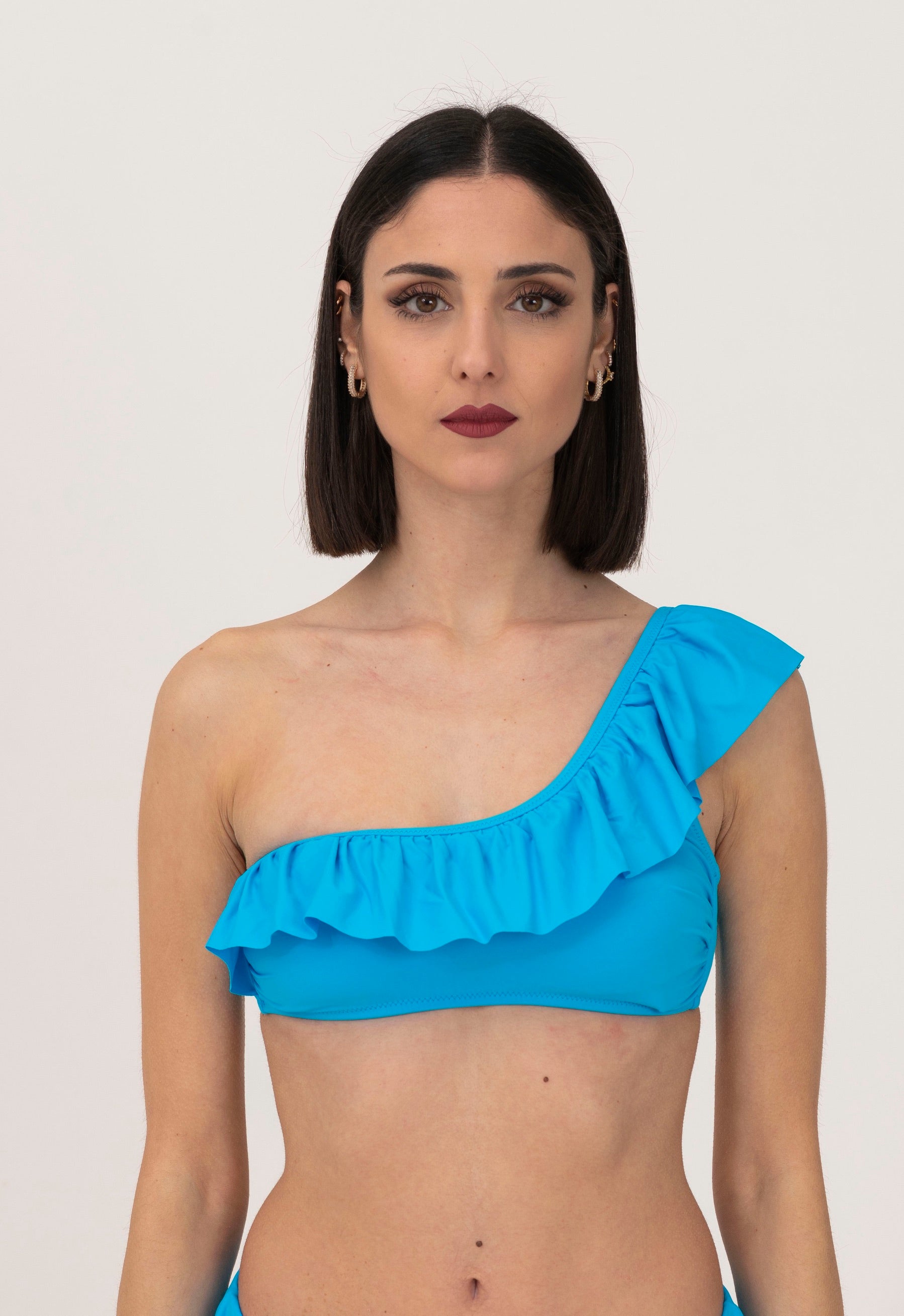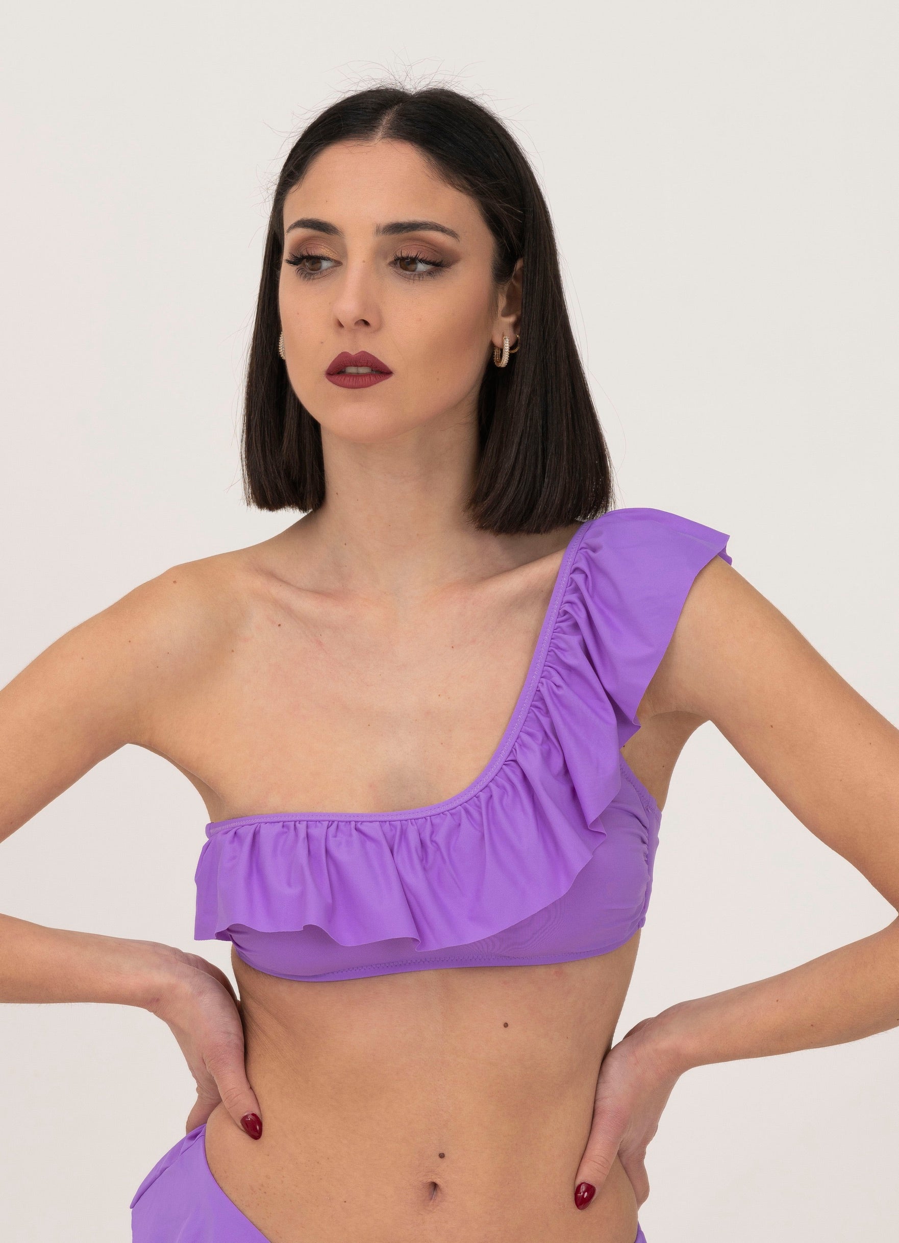 Fascia monospalla con volant .  Coppe estraibili , spalline regolabili e chiusura con gancio .