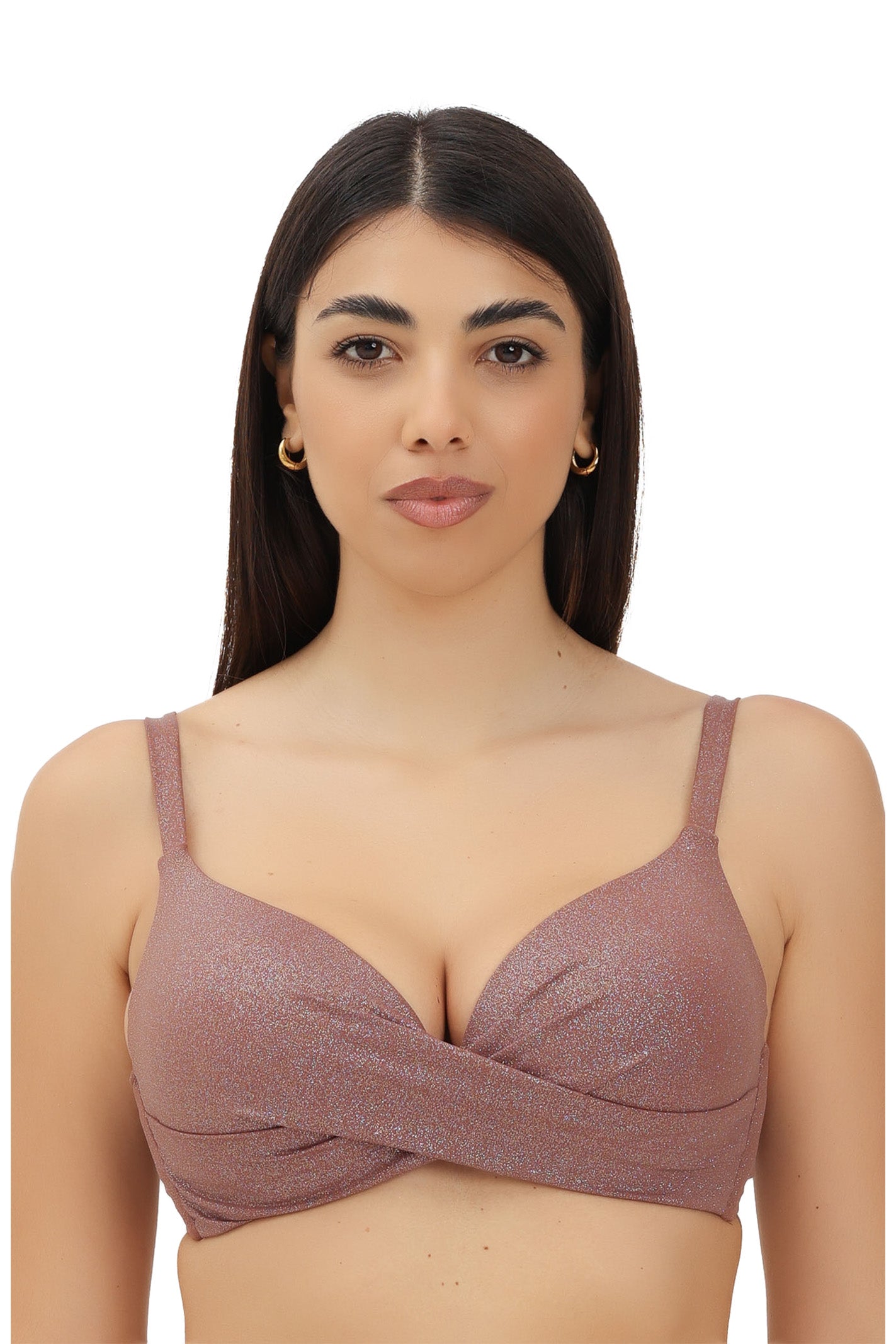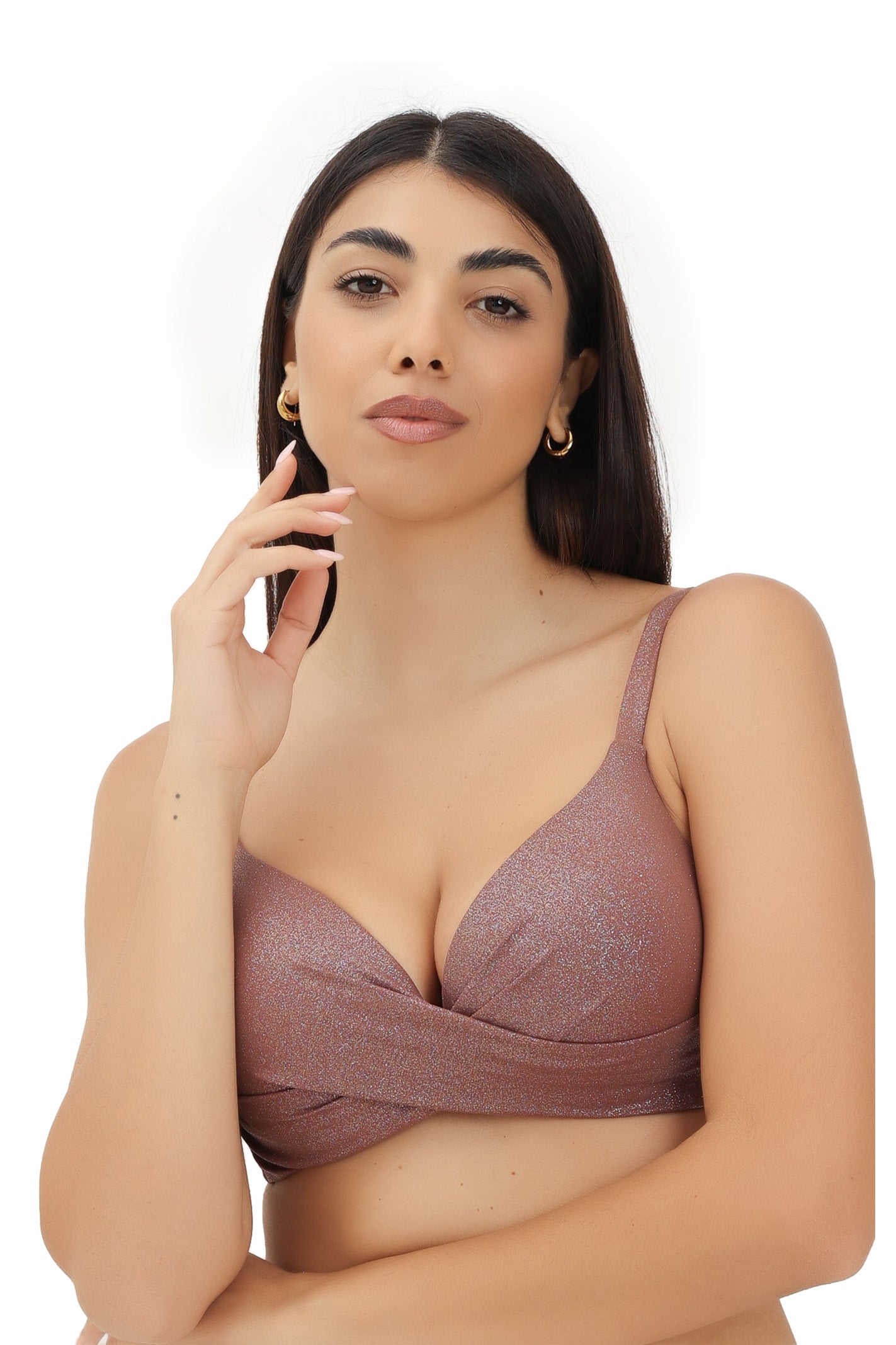 Top bikini con incrocio e ferretto, coppa strutturata non estraibile, spalline e circonferenza regolabili. In microfibra brillantinata glitter super lucente, vestibilità classica.