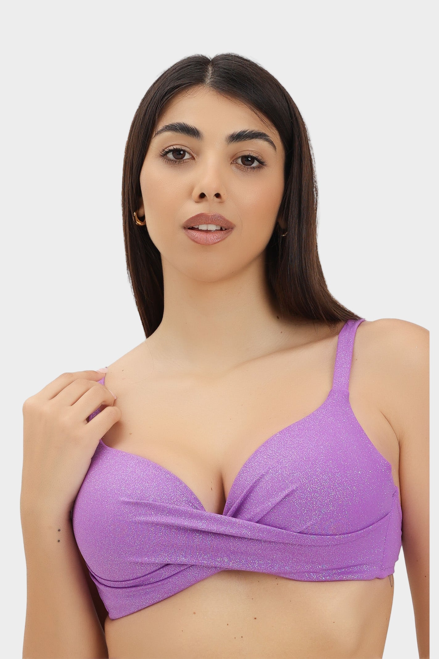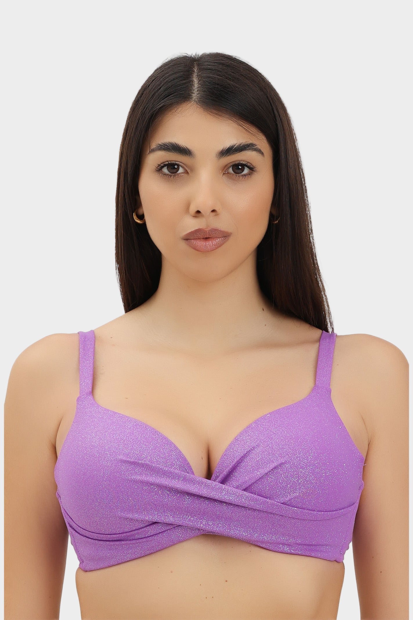 Top bikini con incrocio e ferretto, coppa strutturata non estraibile, spalline e circonferenza regolabili. In microfibra brillantinata glitter super lucente, vestibilità classica. Raffinato e luminoso, il top bikini da donna...