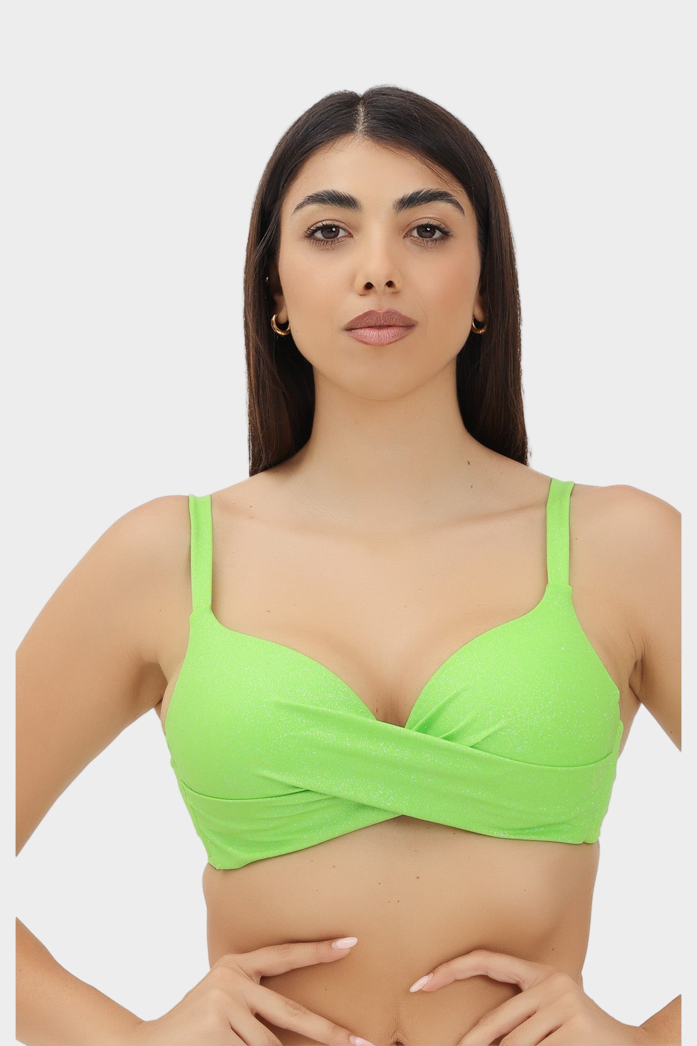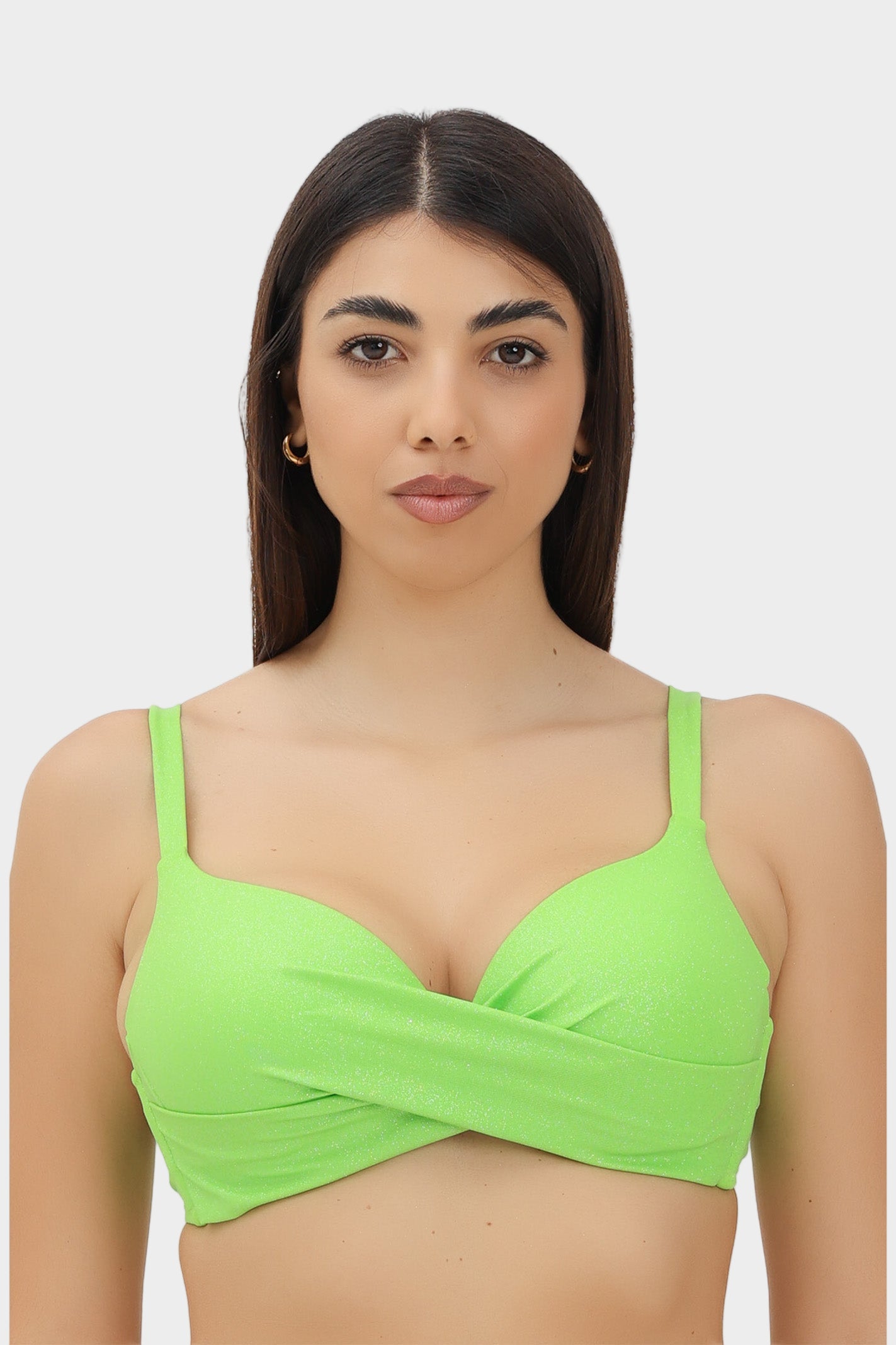 Top bikini con incrocio e ferretto, coppa strutturata non estraibile, spalline e circonferenza regolabili. In microfibra brillantinata glitter super lucente, vestibilità classica. Raffinato e luminoso, il top bikini da donna...