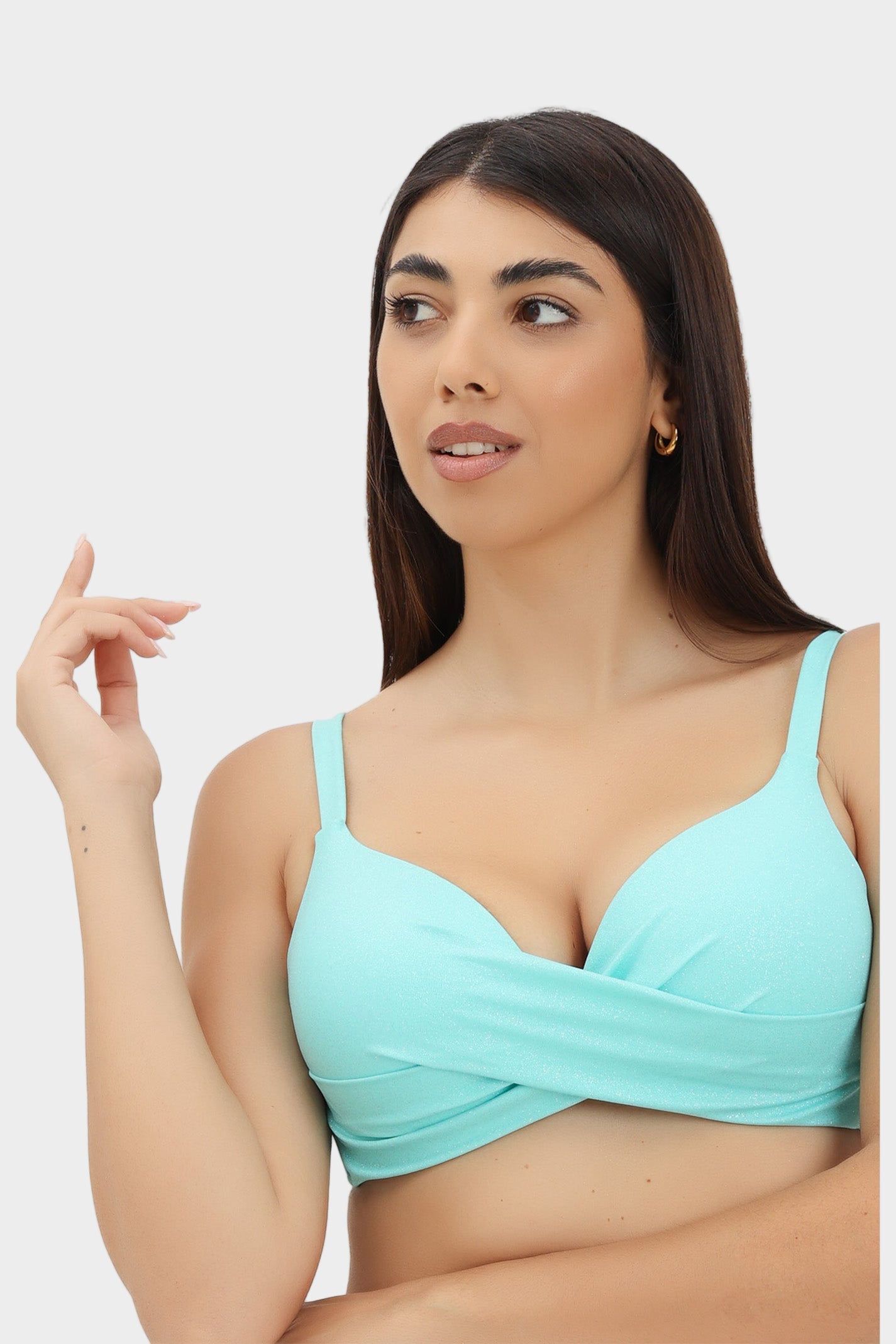 Top bikini con incrocio e ferretto, coppa strutturata non estraibile, spalline e circonferenza regolabili. In microfibra brillantinata glitter super lucente, vestibilità classica. Raffinato e luminoso, il top bikini da donna...