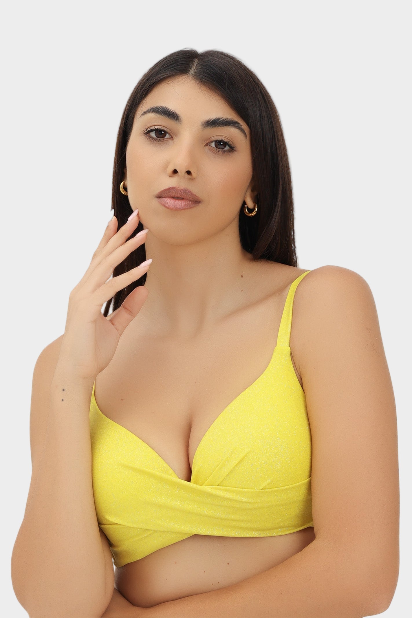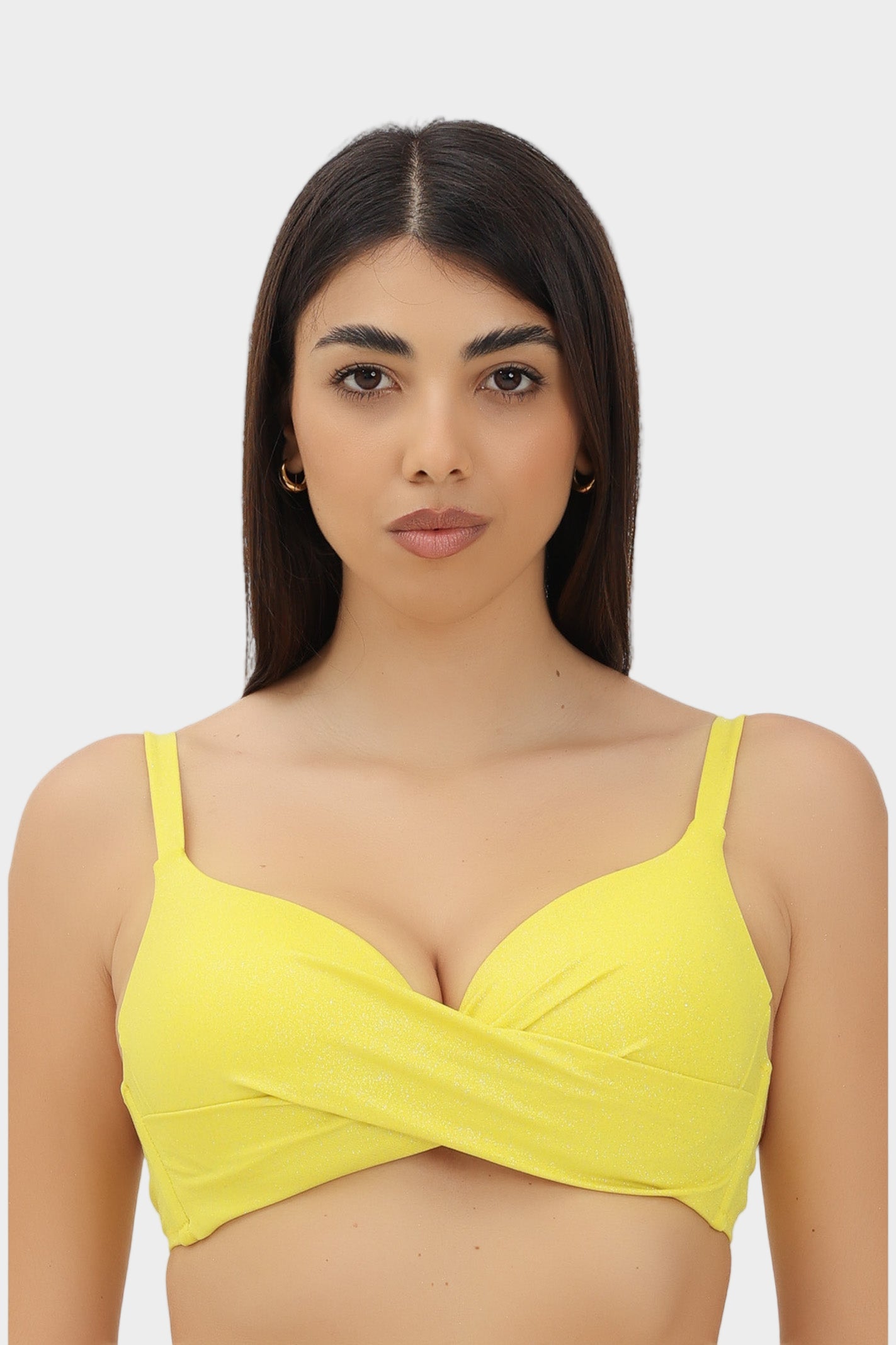 Top bikini con incrocio e ferretto, coppa strutturata non estraibile, spalline e circonferenza regolabili. In microfibra brillantinata glitter super lucente, vestibilità classica. Raffinato e luminoso, il top bikini da donna...