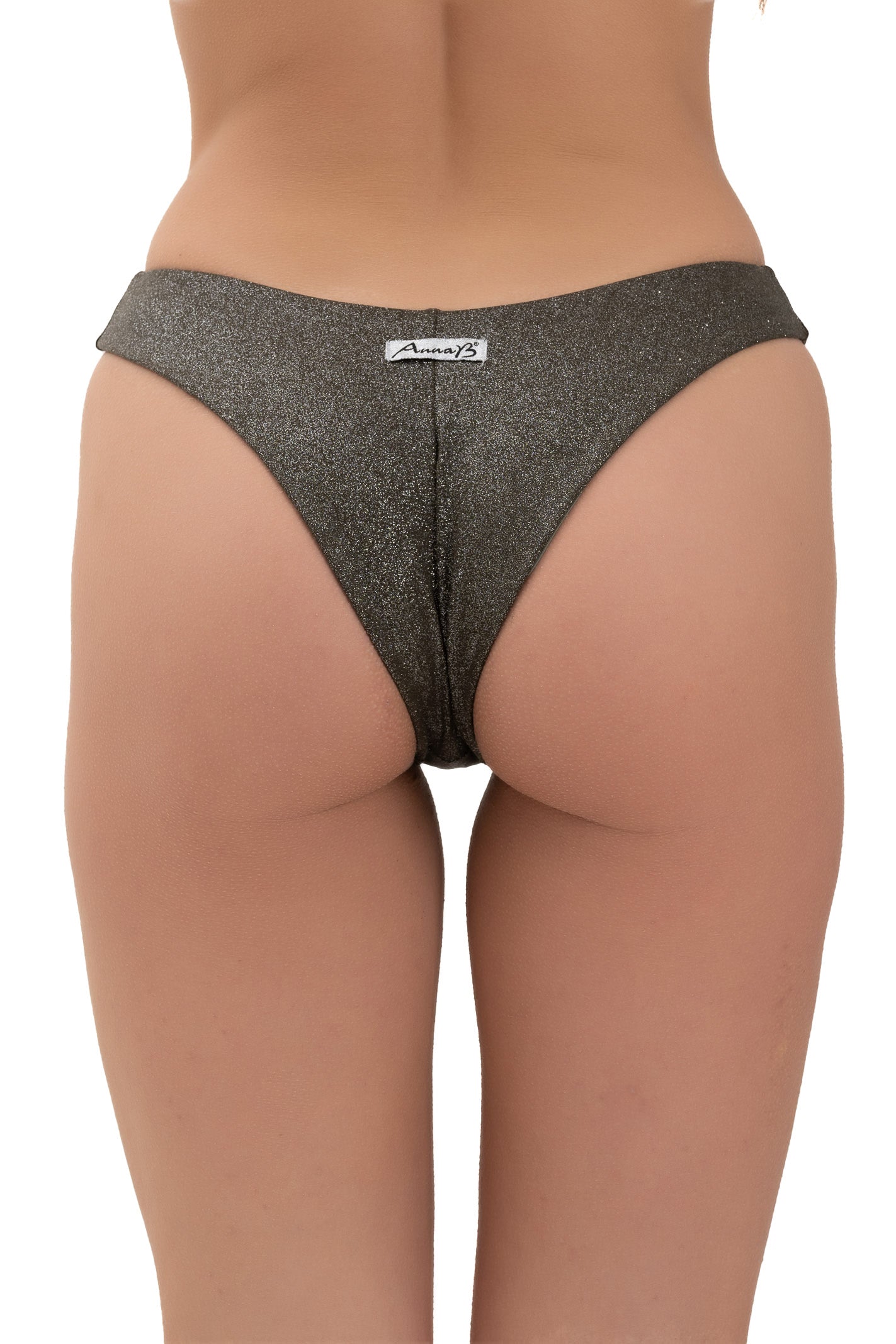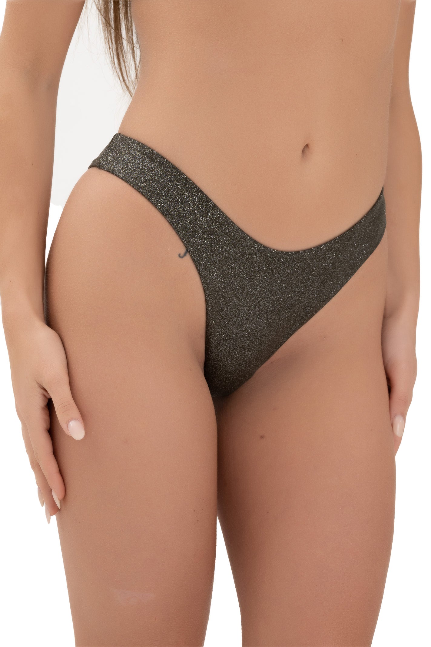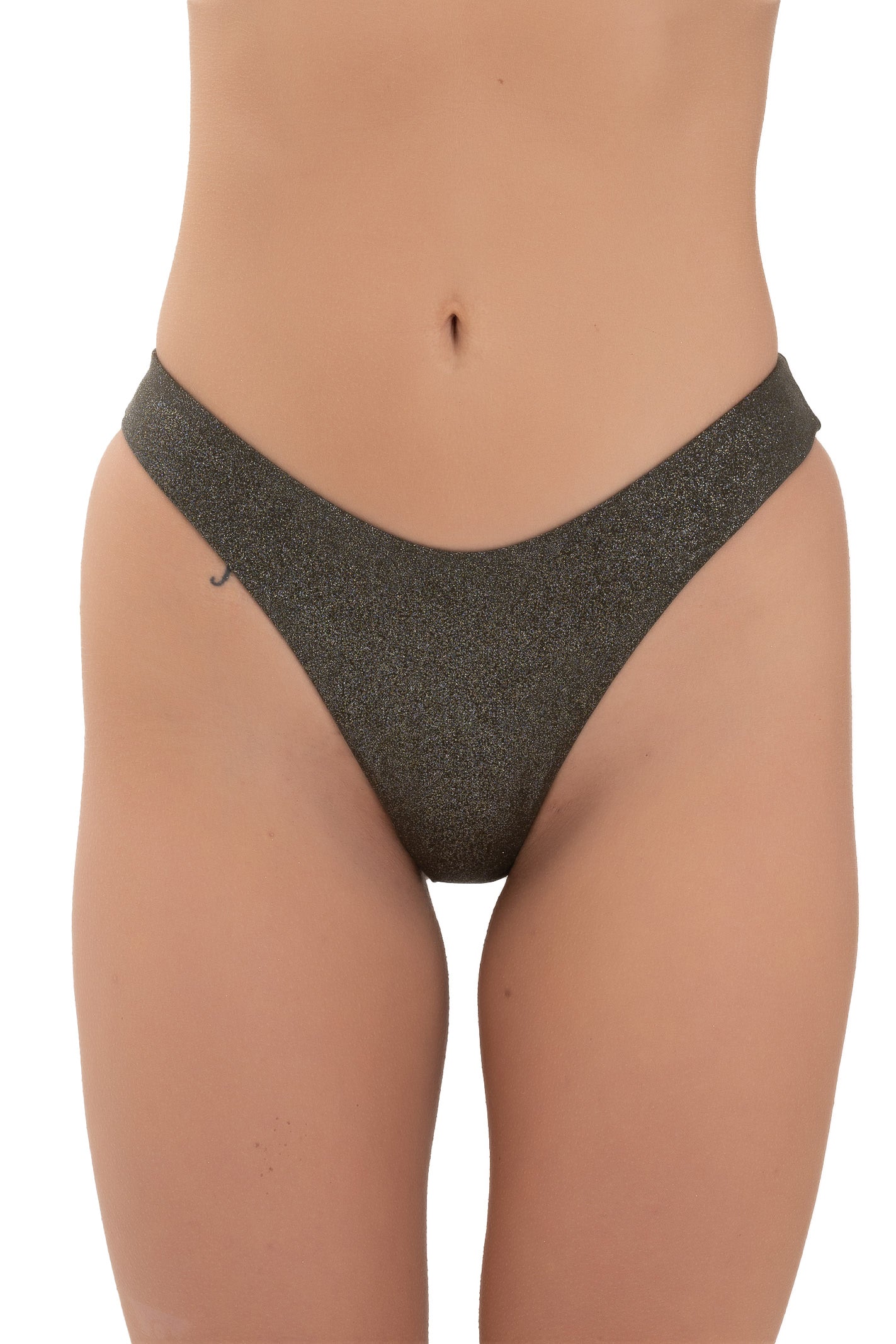 Brasiliana bikini donna in microfibra brillantinata con particolare forma a V che slancia la gamba ed esalta la figura. Coprenza ridotta, effetto super luccicante e splendente al sole.