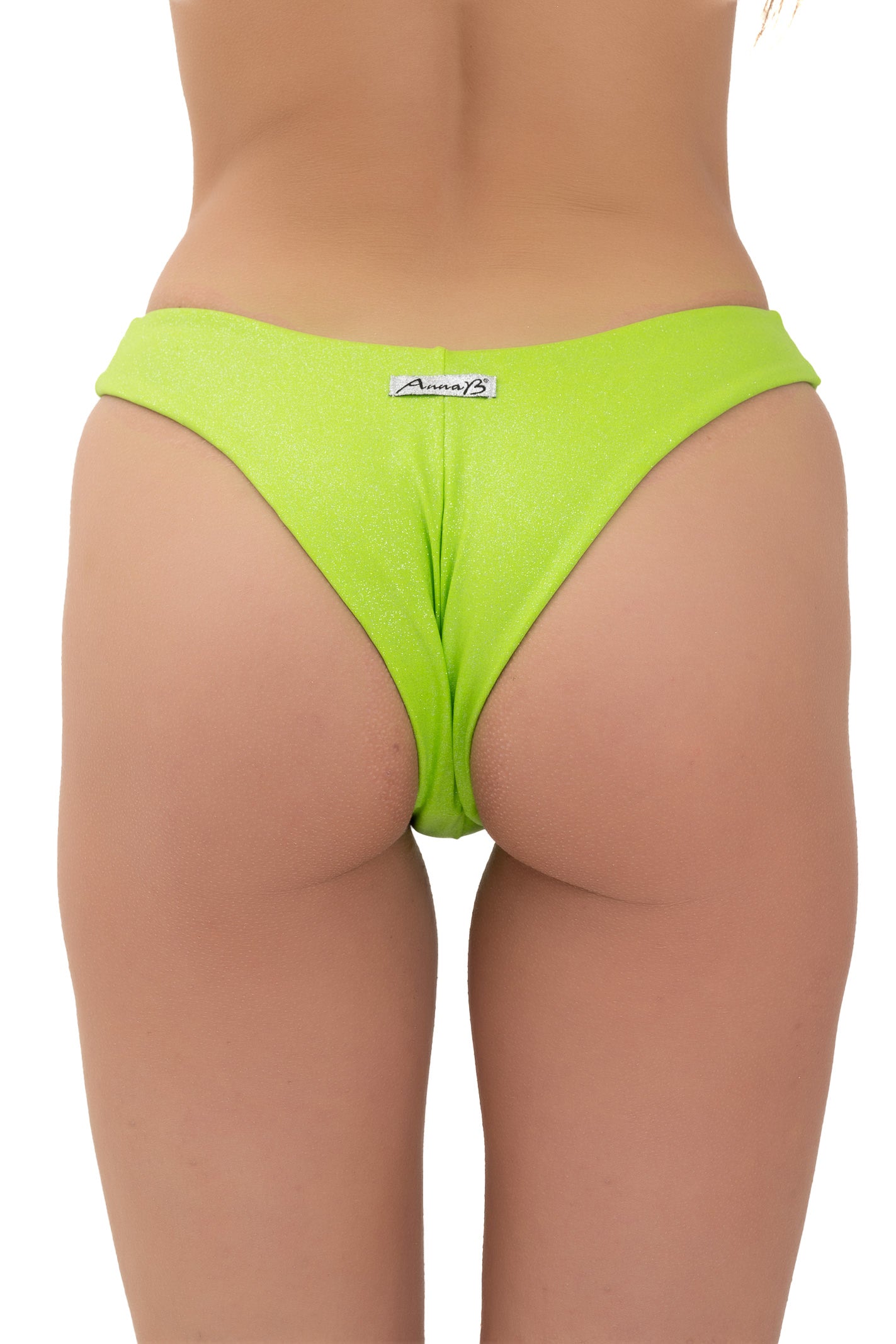 Brasiliana bikini donna in microfibra brillantinata con particolare forma a V che slancia la gamba ed esalta la figura. Coprenza ridotta, effetto super luccicante e splendente al sole.