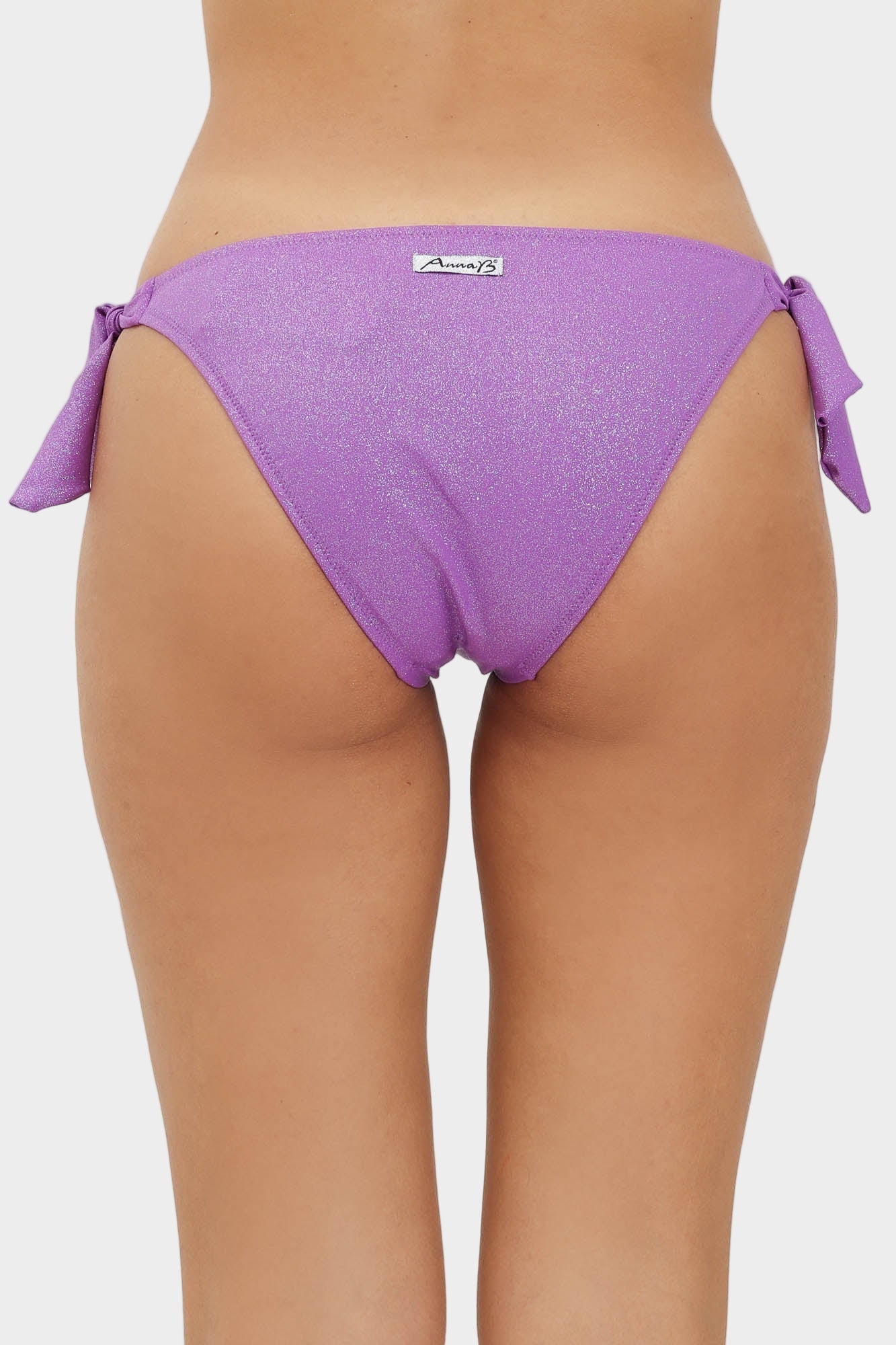 Luminoso e femminile, lo slip bikini da donna con fiocchi annodabili sui fianchi è realizzato in microfibra brillantinata glitter, un tessuto morbido e scintillante che dona un effetto super lucente e glamour al sole.