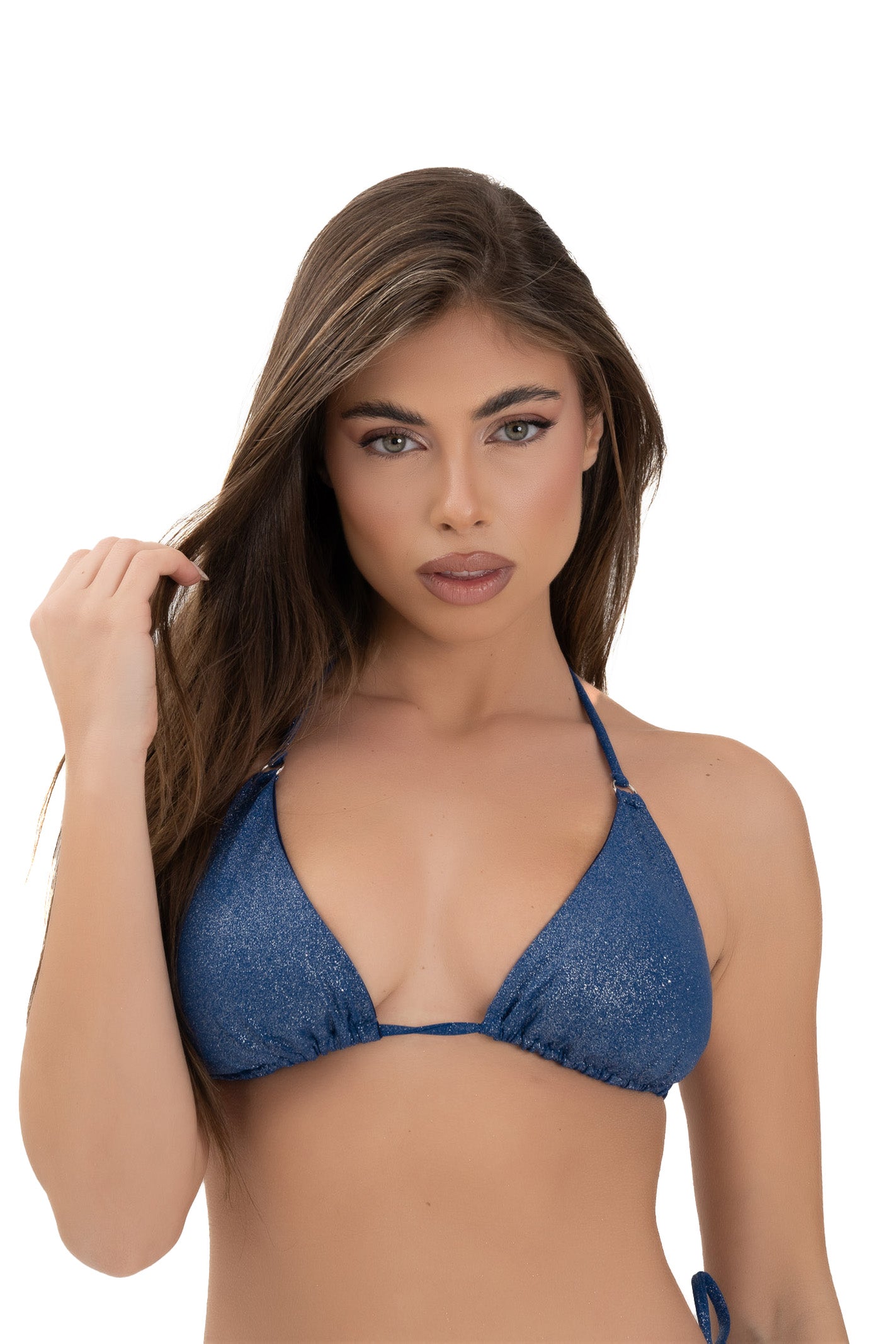 Top bikini triangolo scorrevole imbottito con coppe estraibili, anellini e lacci annodabili. Realizzato in microfibra brillantinata con effetto luccicante al sole.