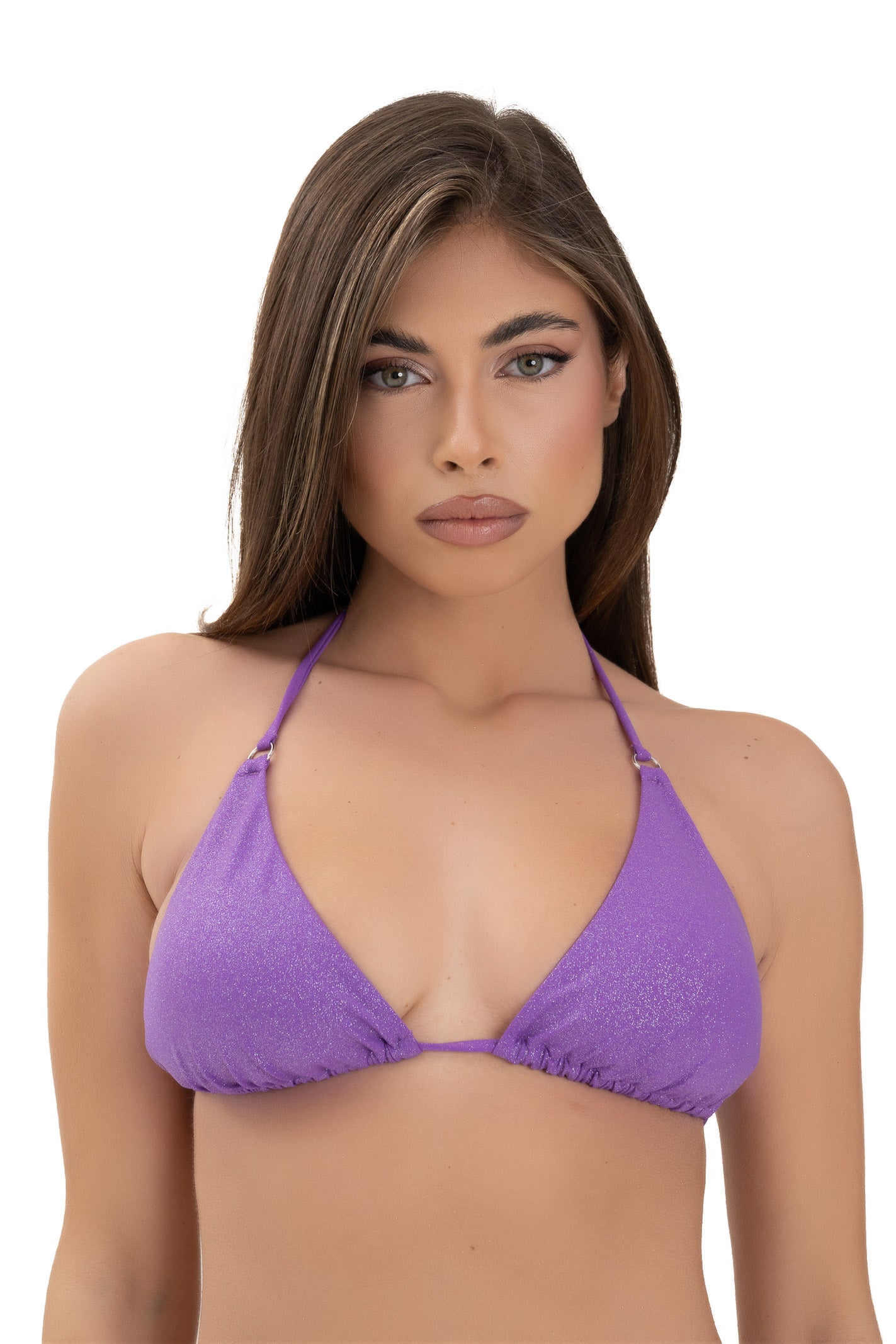 Top bikini triangolo scorrevole imbottito con coppe estraibili, anellini e lacci annodabili. Realizzato in microfibra brillantinata con effetto luccicante al sole. Brillante, femminile e super glam, è pensato per chi ama...