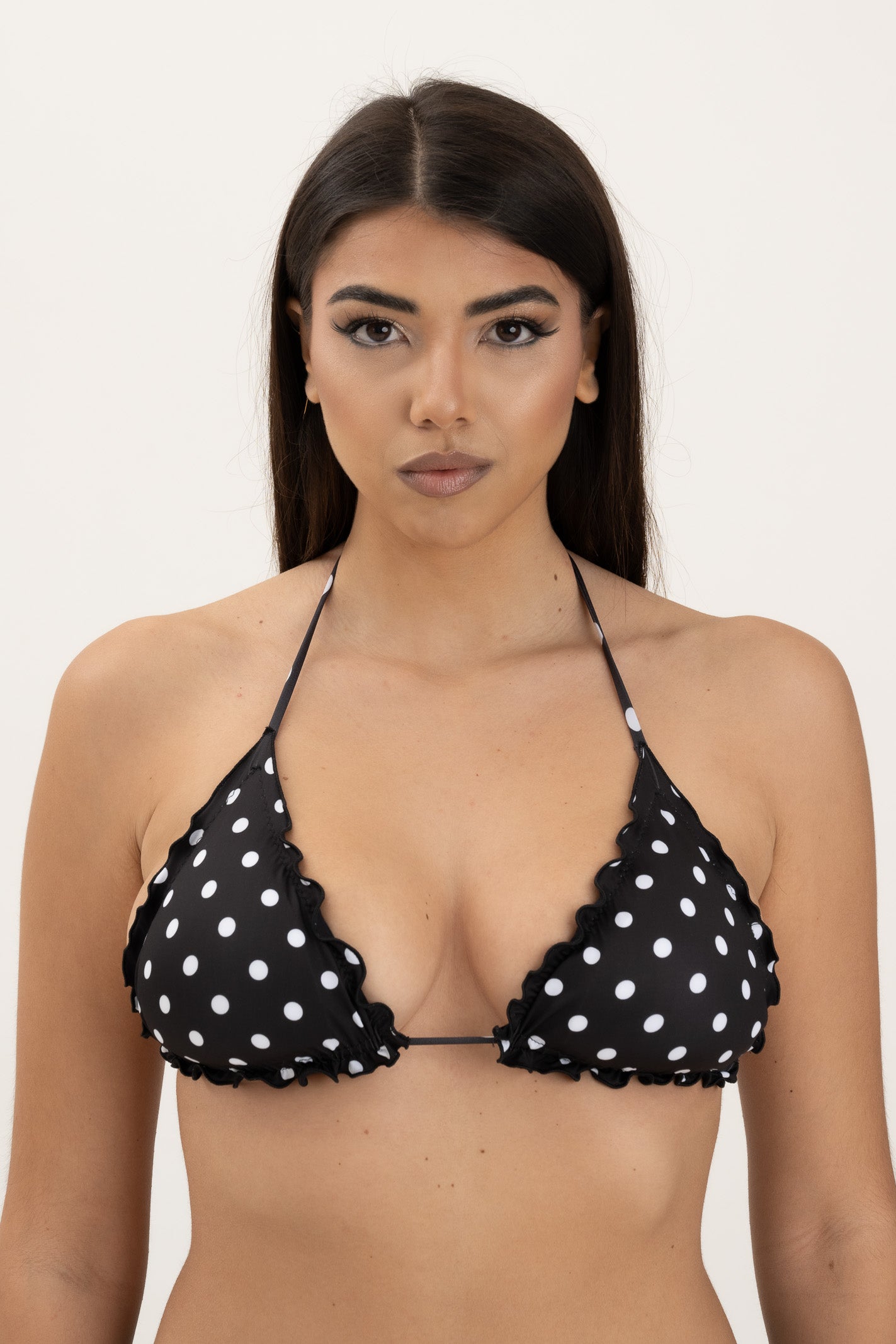 Elegante, raffinato e senza tempo, il Triangolo Frou-Frou è un must-have della stagione estiva. Realizzato in morbida microfibra con una delicata fantasia a pois su fondo nero, questo bikini unisce romanticismo e stile iconico in un design femminile e versatile.