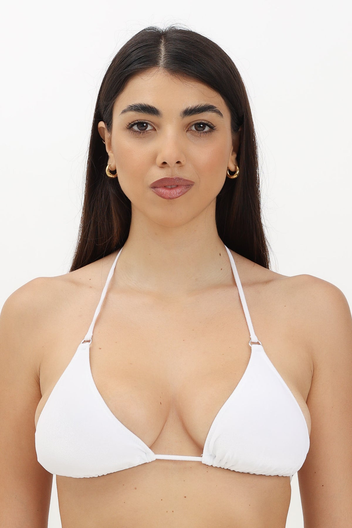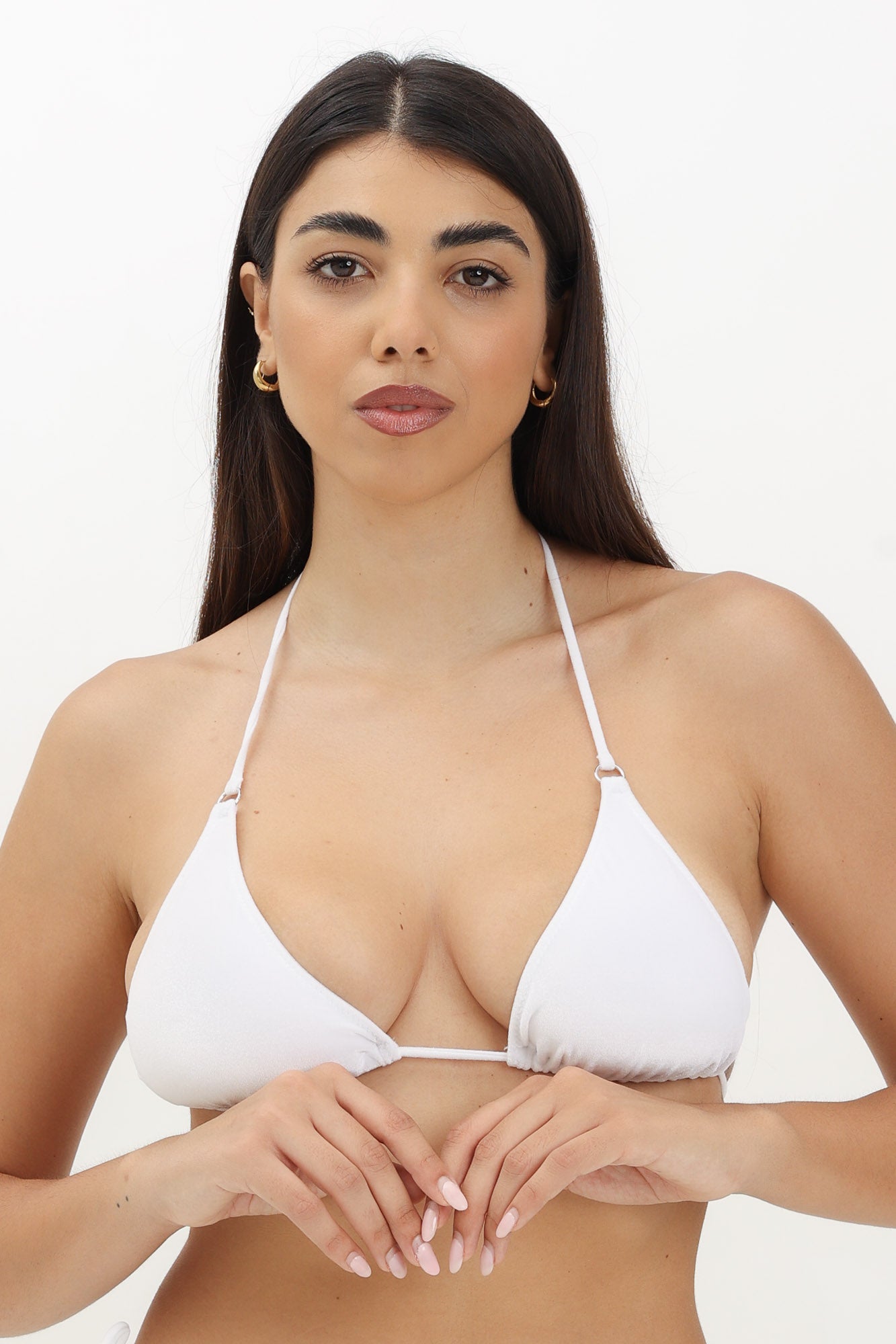 Triangolino con anelli e coppe estraibili realizzato su tessuto Velluto . Chiusura con laccio e totalmente regolabile .