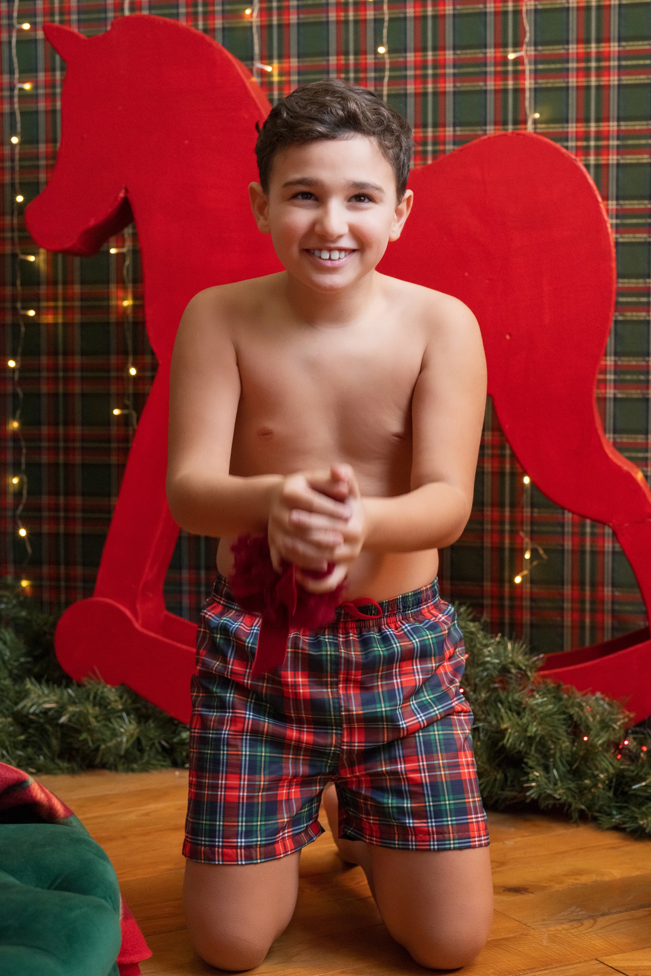 Pantaloncino bambino in Taktel, con elastico e coulisse in vita, realizzato nell'iconico pattern tartan rosso per un'eleganza e uno stile senza tempo