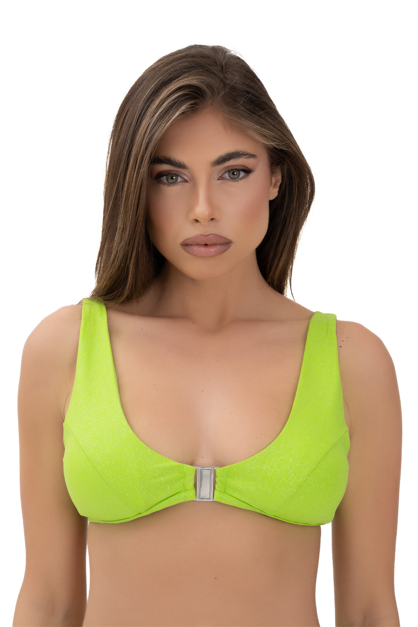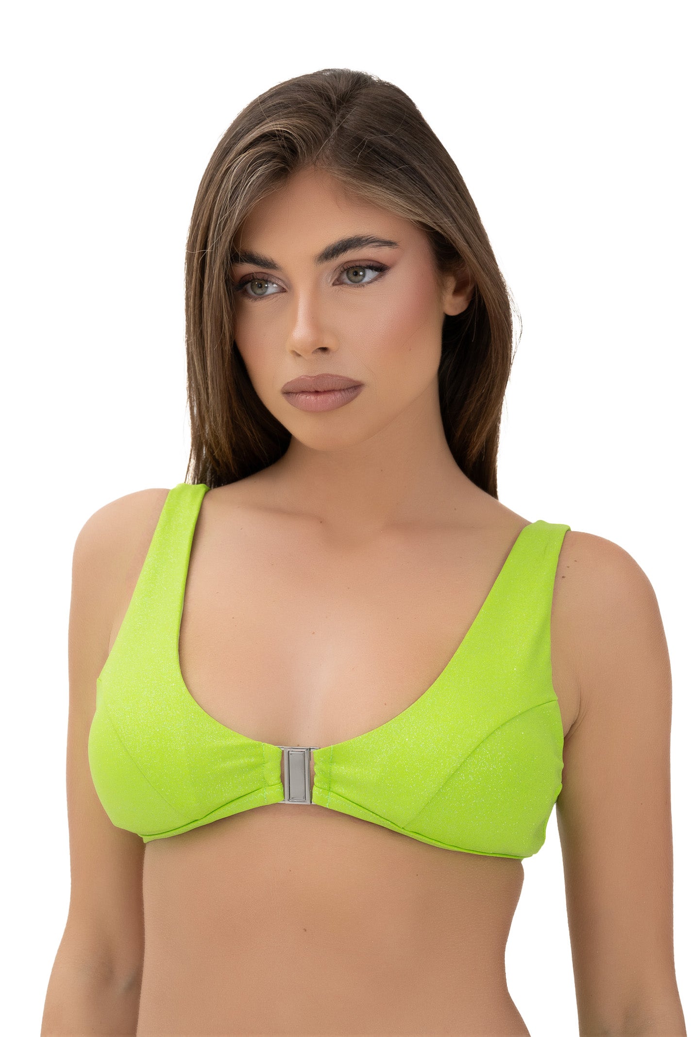 Top bikini modello canotta in microfibra glitterata con gancio centrale in zama nickel free. Coppe estraibili, taglio diagonale sul seno e colori moda scintillanti. ILgancio centrale in zama nickel free ...